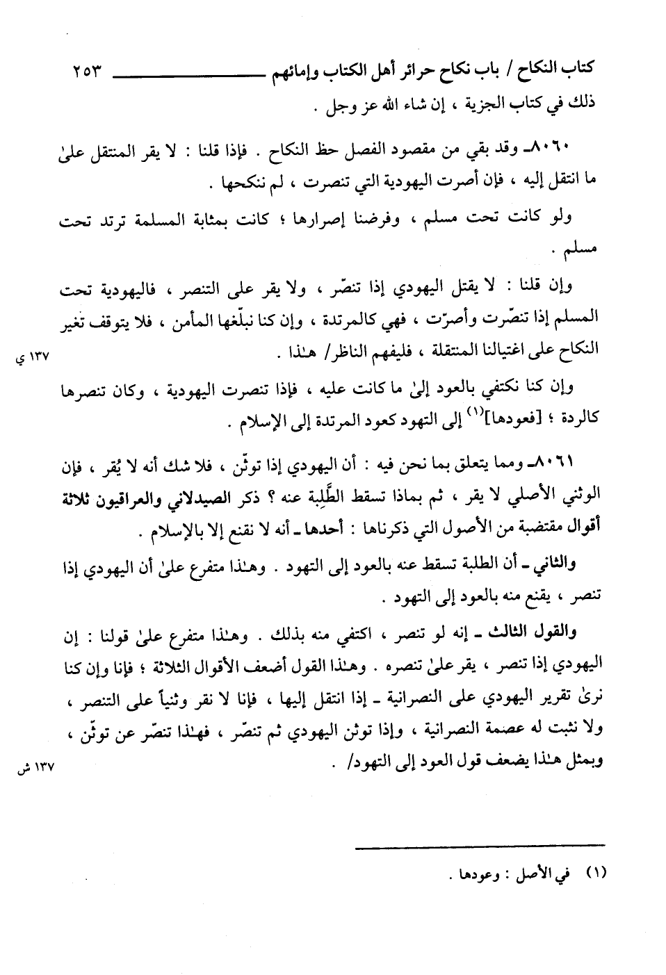 8060 - وقد بقي من مقصود الفصل حظ النكاح. فإذا قلنا: لا يقر المنتقل على ما انتقل إليه، فإن أصرت اليهودية التي تنصرت، لم ننكحها.