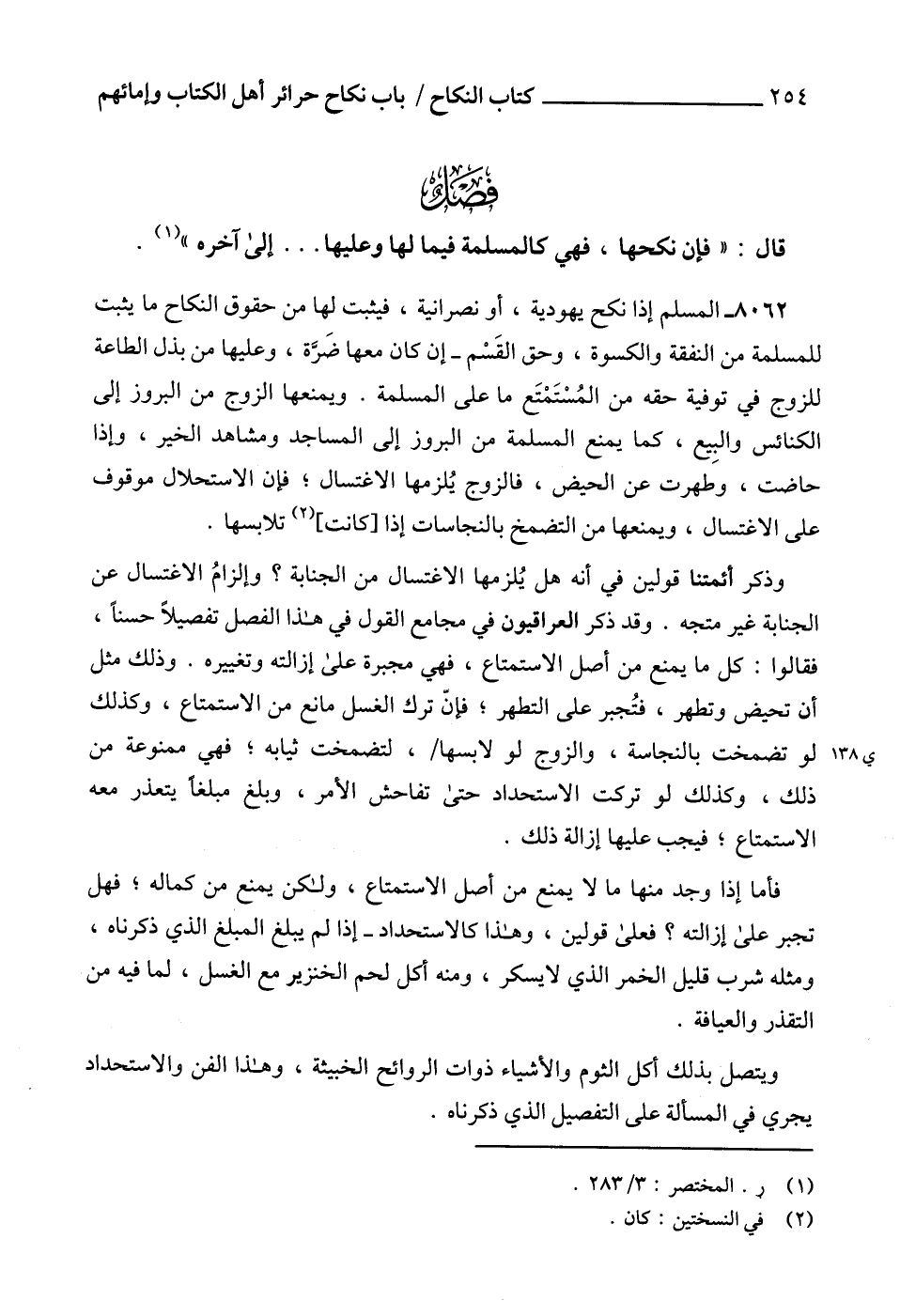 8062 - المسلم إذا نكح يهودية، أو نصرانية، فيثبت لها من حقوق النكاح ما يثبت للمسلمة من النفقة والكسوة، وحق القَسْم - إن كان معها ضَرَّة، وعليها من بذل الطاعة للزوج في توفية حقه من المُسْتَمْتَع ما على المسلمة. ويمنعها الزوج من البروز إلى الكنائس والبِيع، كما يمنع المسلمة من البروز إلى المساجد ومشاهد الخير، وإذا حاضت، وطهرت عن الحيض، فالزوج يُلزمها الاغتسال؛ فإن الاستحلال موقوف على الاغتسال، ويمنعها من التضمخ بالنجاسات إذا [كانت] (2) تلابسها.