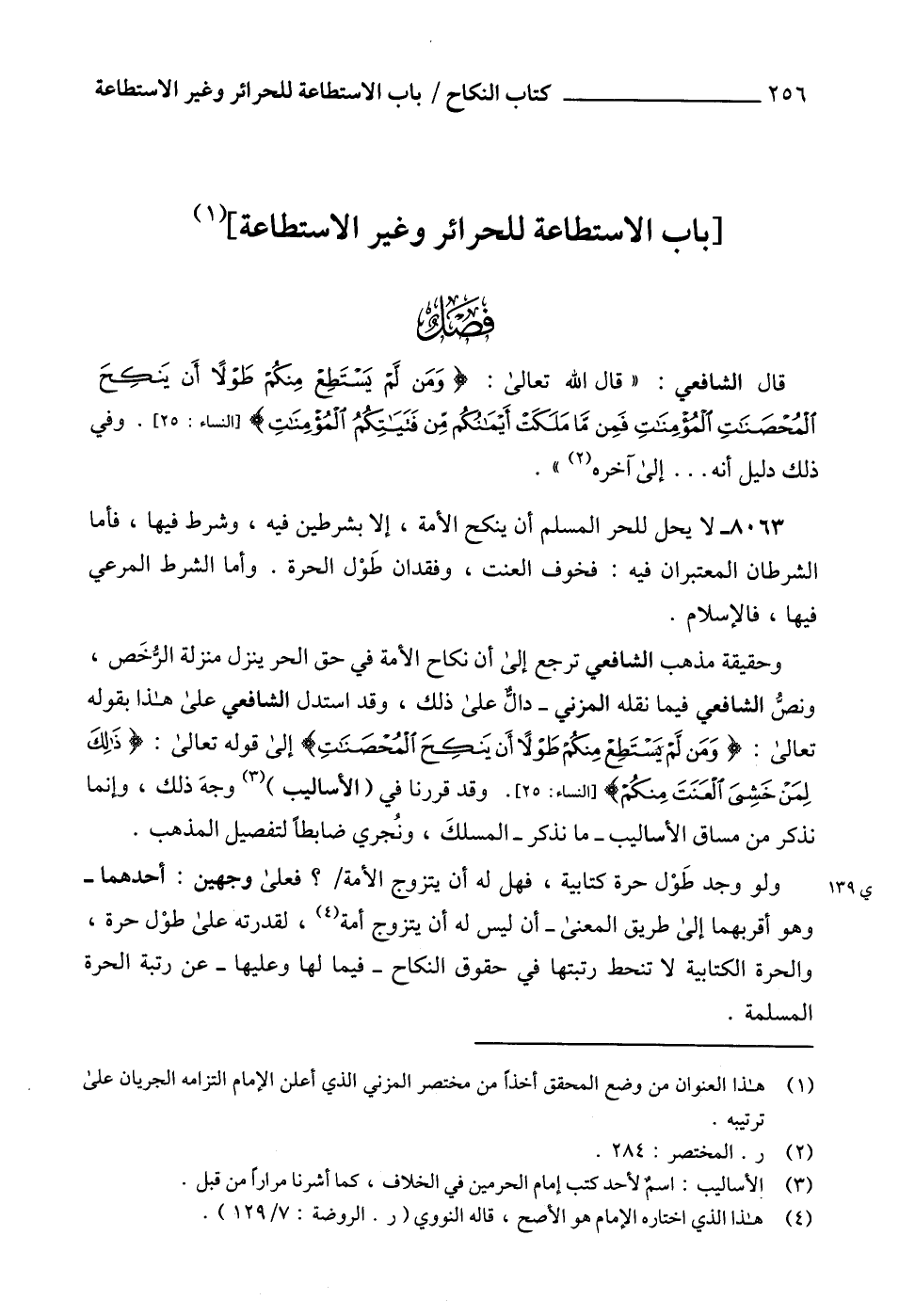 وحقيقة مذهب الشافعي ترجع إلى أن نكاح الأمة في حق الحر ينزل منزلة الرُّخَص، ونصُّ الشافعي فيما نقله المزني - دالٌّ على ذلك، وقد استدل الشافعي على هذا بقوله تعالى: {وَمَنْ لَمْ يَسْتَطِعْ مِنْكُمْ طَوْلًا أَنْ يَنْكِحَ الْمُحْصَنَاتِ} إلى قوله تعالى: {ذَلِك لِمَنْ خَشِيَ الْعَنَت} [النساء: 25]. وقد قررنا في (الأساليب) (3) وجهَ ذلك، وإنما نذكر من مساق الأساليب -ما نذكر- المسلكَ، وئجري ضابطاً لتفصيل المذهب.
