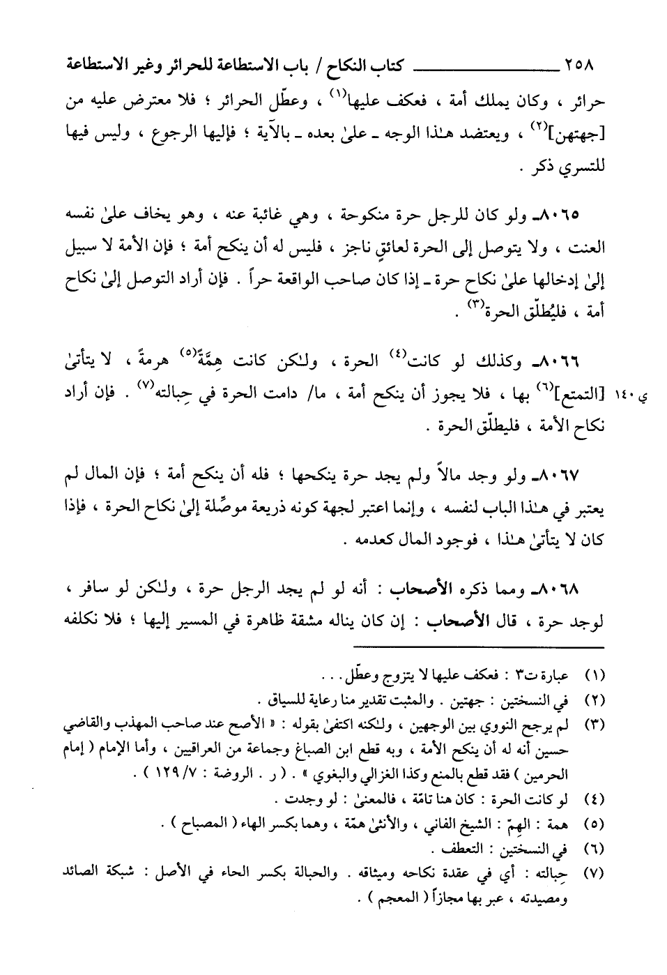 8065 - ولو كان للرجل حرة منكوحة، وهي غائبة عنه، وهو يخاف على نفسه العنت، ولا يتوصل إلى الحرة لعائقٍ ناجز، فليس له أن ينكح أمة؛ فإن الأمة لا سبيل إلى إدخالها على نكاح حرة - إذا كان صاحب الواقعة حراً. فإن أراد التوصل إلى نكاح أمة، فليُطلّق الحرة (3).