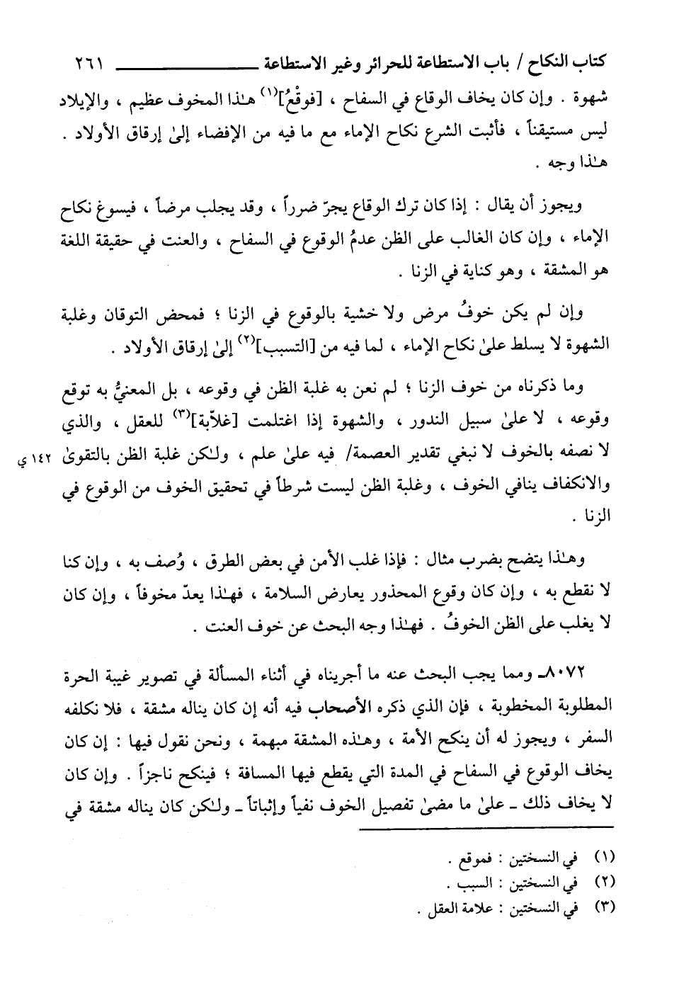 وما ذكرناه من خوف الزنا؛ لم نعن به غلبة الظن في وقوعه، بل المعنيُّ به توقع وقوعه، لا على سبيل الندور، والشهوة إذا اغتلمت [غلاّبة] (3) للعقل، والذي لا نصفه بالخوف لا نبغي تقدير العصمة فيه على علم، ولكن غلبة الظن بالتقوى والانكفاف ينافي الخوف، وغلبة الظن ليست شرطاً في تحقيق الخوف من الوقوع في الزنا.
