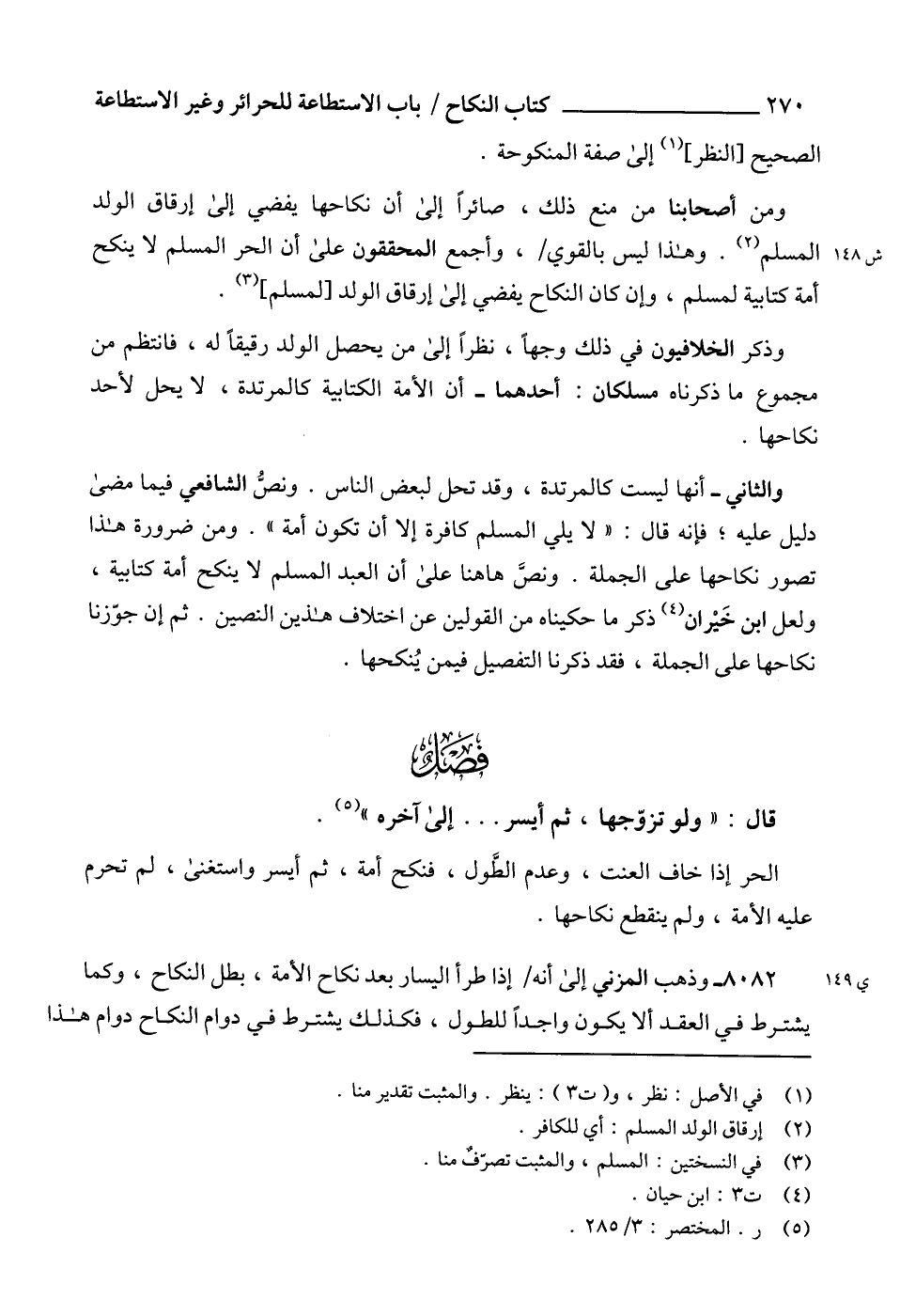 ومن أصحابنا من منع ذلك، صائراً إلى أن نكاحها يفضي إلى إرقاق الولد المسلم (2). وهذا ليس بالقوي، وأجمع المحققون على أن الحر المسلم لا ينكح أمة كتابية لمسلم، وإن كان النكاح يفضي إلى إرقاق الولد [لمسلم] (3).