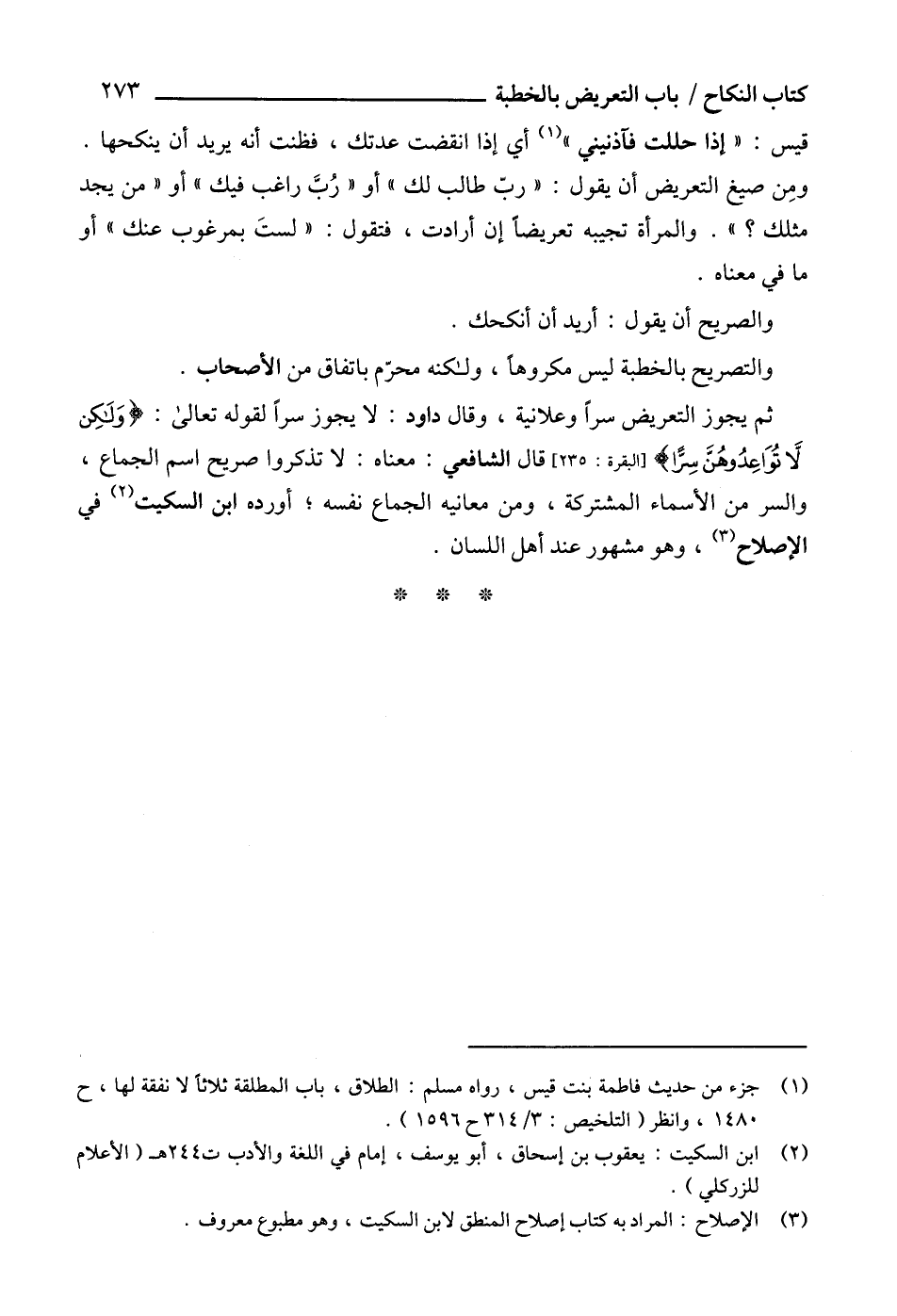 ثم يجوز التعريض سراً وعلانية، وقال داود: لا يجوز سراً لقوله تعالى: {وَلَكِن لَا تُوَاعِدُوهُنَّ سِرًّا} [البقرة: 235] قال الشافعي: معناه: لا تذكروا صريح اسم الجماع، والسر من الأسماء المشتركة، ومن معانيه الجماع نفسه؛ أورده ابن السكيت (2) في الإصلاح (3)، وهو مشهور عند أهل اللسان.