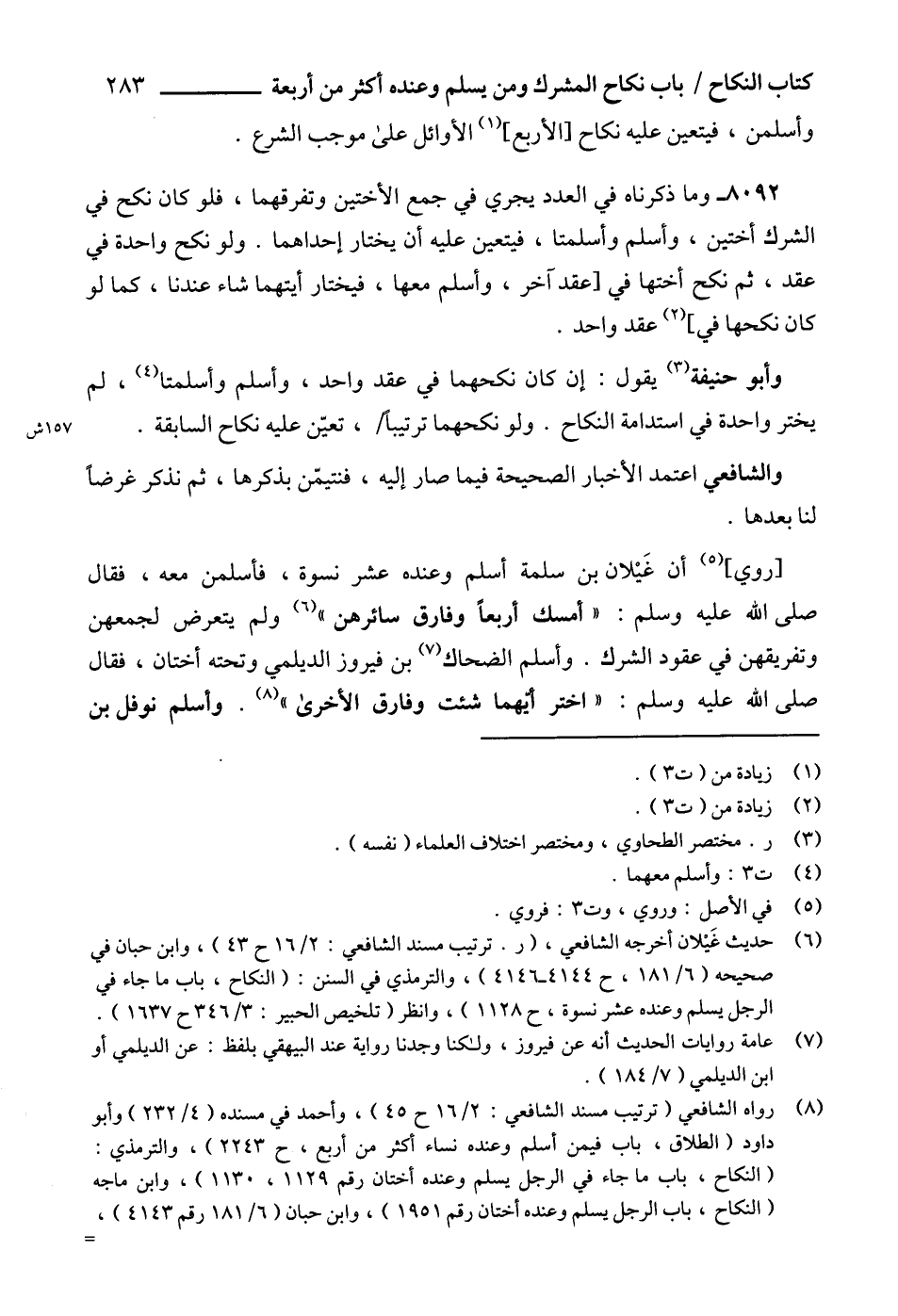(8) رواه الشافعي (ترتيب مسند الشافعي: 2/ 16 ح 45)، وأحمد في مسنده (4/ 232) وأبو داود (الطلاق، باب فيمن أسلم وعنده نساء أكثر من أربع، ح 2243)، والترمذي: (النكاح، باب ما جاء في الرجل يسلم وعنده أختان رقم 1129، 1130)، وابن ماجه (النكاح، باب الرجل يسلم وعنده أختان رقم 1951)، وابن حبان (6/ 181 رقم 4143)، =