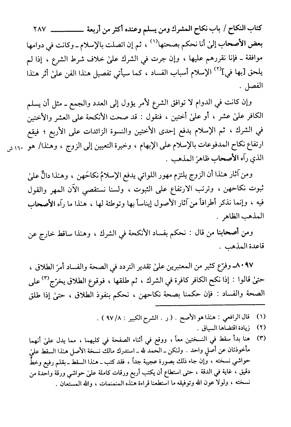 وإن كانت في الدوام لا توافق الشرع لأمر يؤول إلى العدد والجمع - مثل أن يسلم الكافر على عشر، أو على أختين، فنقول: قد صحت الأنكحة على العشر والأختين في الشرك، ثم الإسلام يدفع إحدى الأختين والنسوة الزائدات على الأربع؛ فيقع ارتفاع نكاح المدفوعات بالإسلام على الإبهام، وخيرة التعيين إلى الزوج، وهذا هو الذي رآه الأصحاب ظاهرَ المذهب.
