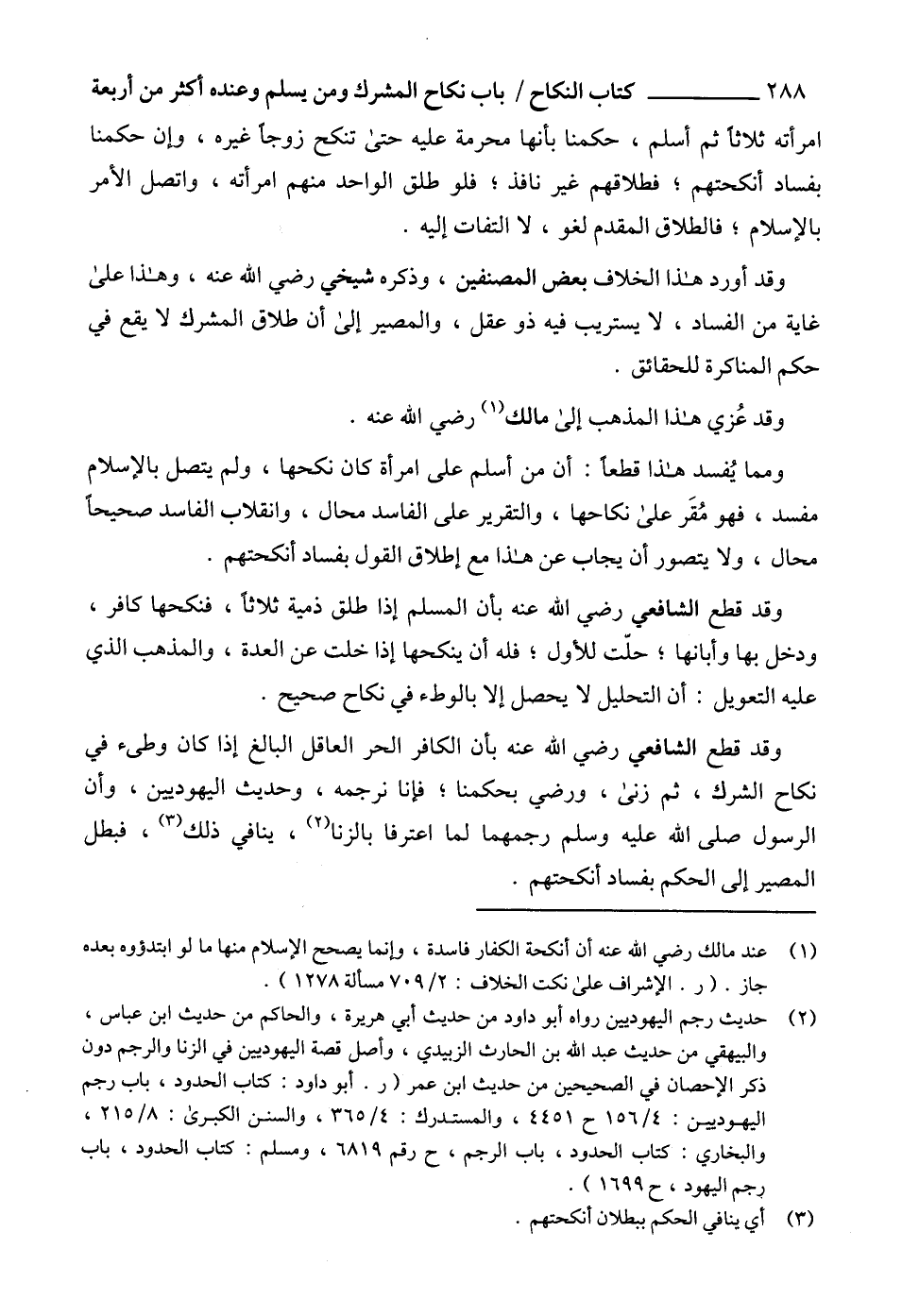 وقد قطع الشافعي رضي الله عنه بأن الكافر الحر العاقل البالغ إذا كان وطىء في نكاح الشرك، ثم زنى، ورضي بحكمنا؛ فإنا نرجمه، وحديث اليهوديين، وأن الرسول صلى الله عليه وسلم رجمهما لما اعترفا بالزنا (2)، ينافي ذلك (3)، فبطل المصير إلى الحكم بفساد أنكحتهم.