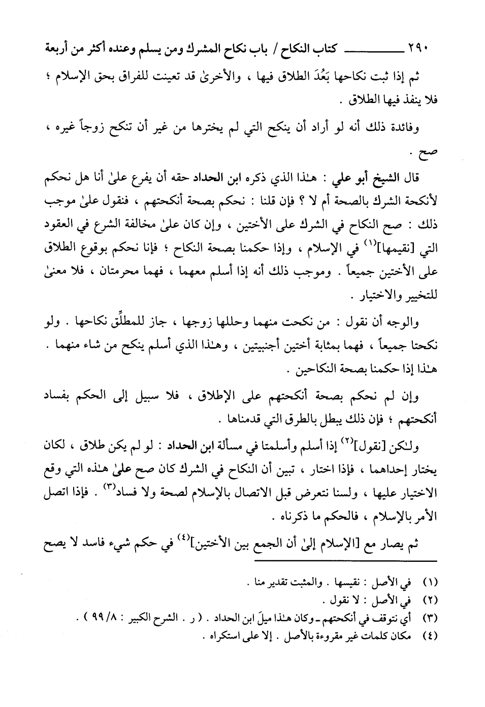 ولكن [نقول] (2) إذا أسلم وأسلمتا في مسألة ابن الحداد: لو لم يكن طلاق، لكان يختار إحداهما، فإذا اختار، تبين أن النكاح في الشرك كان صح على هذه التي وقع الاختيار عليها، ولسنا نتعرض قبل الاتصال بالإسلام لصحة ولا فساد (3). فإذا اتصل الأمر بالإسلام، فالحكم ما ذكرناه.