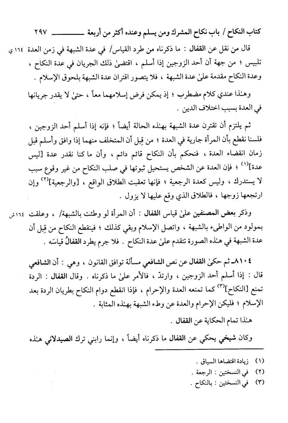 قال من نقل عن القفال: ما ذكرناه من طرد القياس في عدة الشبهة في زمن العدة تلبيس؛ من جهة أن أحد الزوجين إذا أسلم، اقتضى ذلك الجريان في عدة النكاح، وعدة النكاح مقدمة على عدة الشبهة، فلا يتصور اقتران عدة الشبهة بلحوق الإسلام.