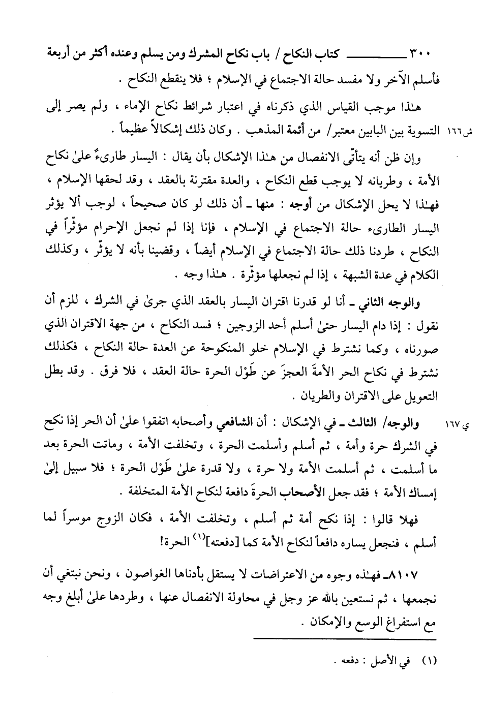 وإن ظن أنه يتأتّى الانفصال من هذا الإشكال بأن يقال: اليسار طارىءٌ على نكاح الأمة، وطريانه لا يوجب قطع النكاح، والعدة مقترنة بالعقد، وقد لحقها الإسلام، فهذا لا يحل الإشكال من أوجه: منها - أن ذلك لو كان صحيحاً، لوجب ألا يؤثر اليسار الطارىء حالة الاجتماع في الإسلام، فإنا إذا لم نجعل الإحرام مؤثّراً في النكاح، طردنا ذلك حالة الاجتماع في الإسلام أيضاً، وقضينا بأنه لا يؤثر، وكذلك الكلام في عدة الشبهة، إذا لم نجعلها مؤثّرة. هذا وجه.