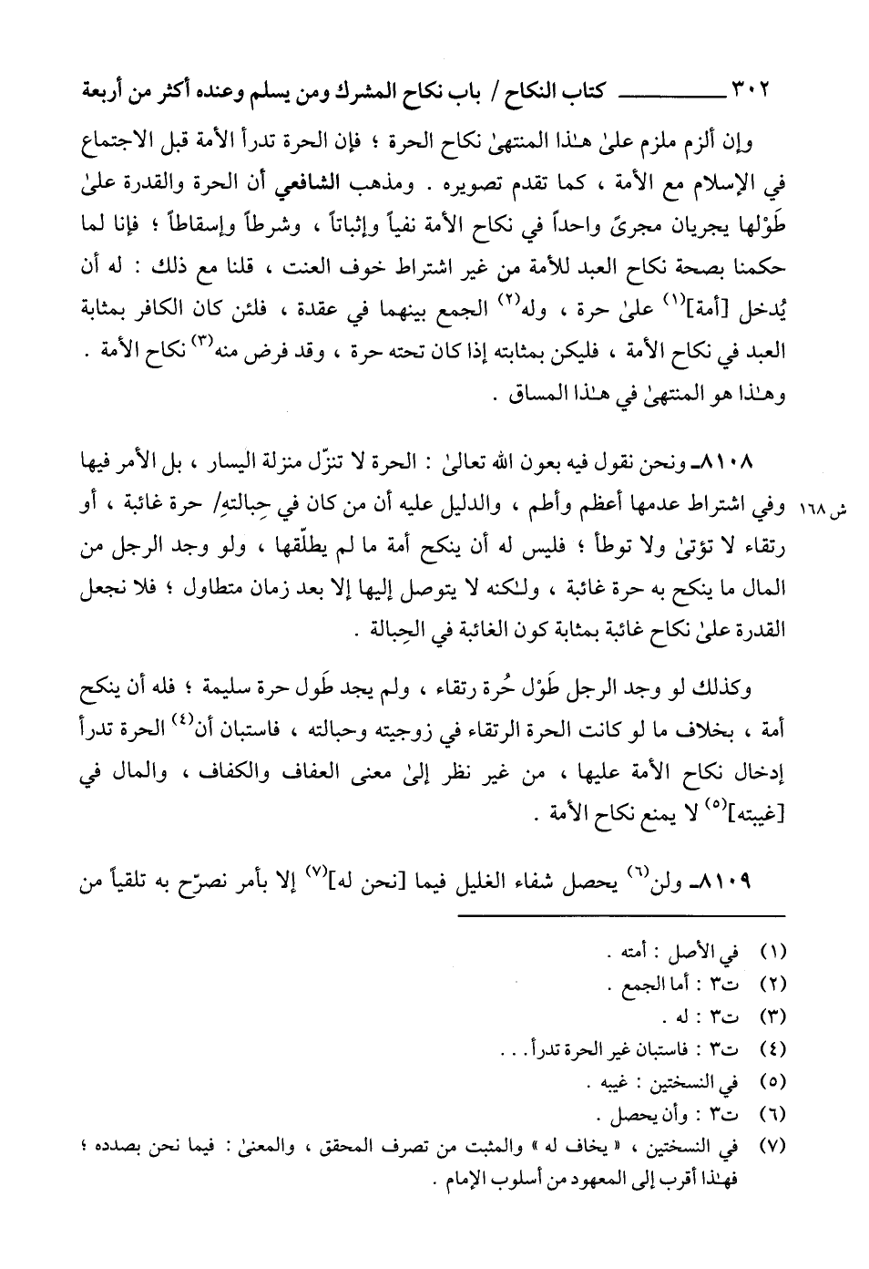 8108 - ونحن نقول فيه بعون الله تعالى: الحرة لا تنزّل منزلة اليسار، بل الأمر فيها وفي اشتراط عدمها أعظم وأطم، والدليل عليه أن من كان في حِبالتهِ حرة غائبة، أو رتقاء لا تؤتى ولا توطأ؛ فليس له أن ينكح أمة ما لم يطلّقها، ولو وجد الرجل من المال ما ينكح به حرة غائبة، ولكنه لا يتوصل إليها إلا بعد زمان متطاول؛ فلا نجعل القدرة على نكاح غائبة بمثابة كون الغائبة في الحِبالة.
