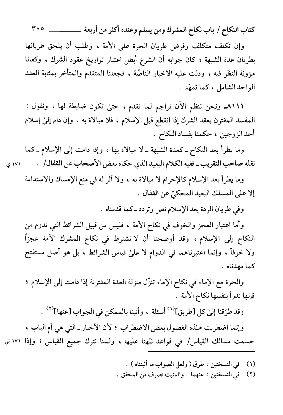 8111 - ونحن ننظم الآن تراجم لما تقدم، حتى تكون ضابطة لها، ونقول: المفسد المقترن بعقد الشرك إذا انقطع قبل الإسلام، فلا مبالاة به. وإن دام إلى إسلام أحد الزوجين، حكمنا بفساد النكاح.