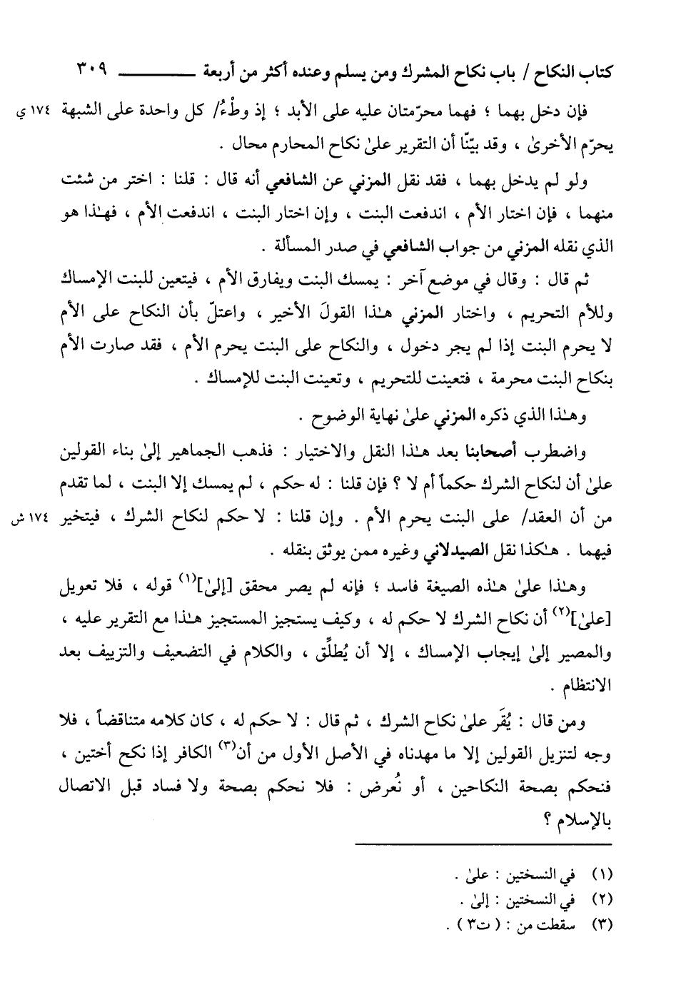 ومن قال: يُقَر على نكاح الشرك، ثم قال: لا حكم له، كان كلامه متناقضاً، فلا وجه لتنزيل القولين إلا ما مهدناه في الأصل الأول من أن (3) الكافر إذا نكح أختين، فنحكم بصحة النكاحين، أو نُعرض: فلا نحكم بصحة ولا فساد قبل الاتصال بالإسلام؟