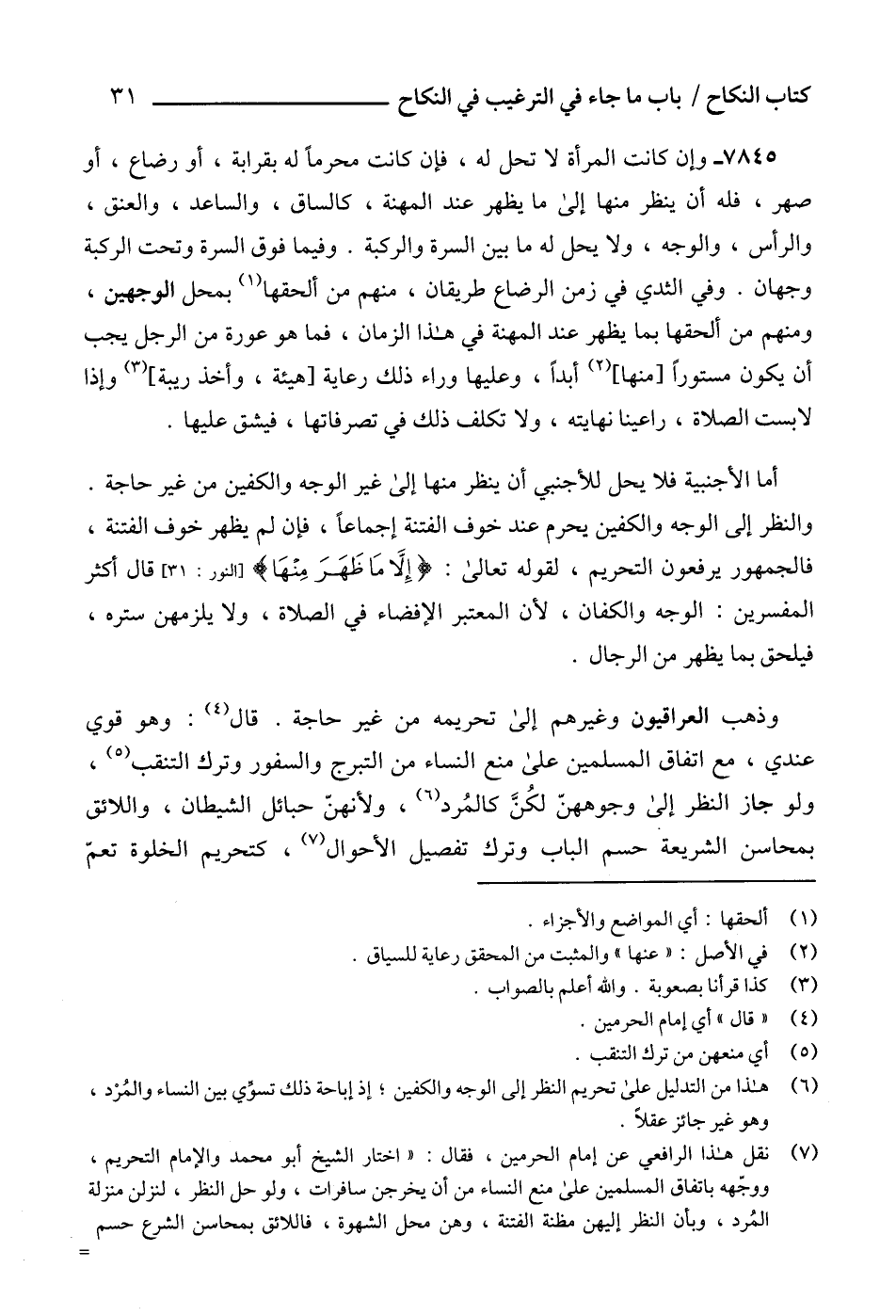 (7) نقل هذا الرافعي عن إمام الحرمين، فقال: "اختار الشيخ أبو محمد والإمام التحريم، ووجّهه باتفاق المسلمين على منع النساء من أن يخرجن سافرات، ولو حل النظر، لنزلن منزلة المُرد، وبأن النظر إليهن مظنة الفتنة، وهن محل الشهوة، فاللائق بمحاسن الشرع حسم =