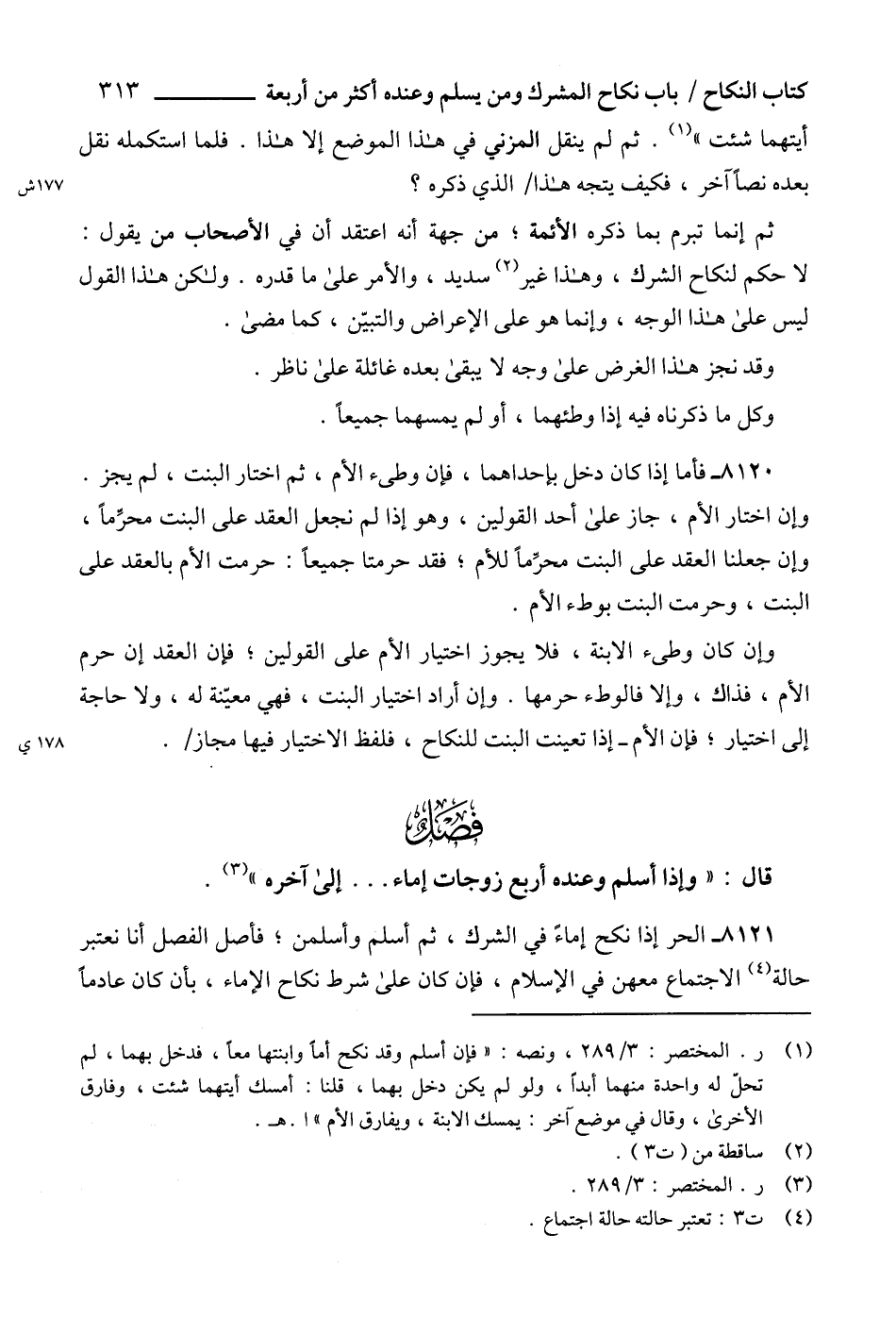(1) ر. المختصر: 3/ 289، ونصه: "فإن أسلم وقد نكح أماً وابنتها معاً، فدخل بهما، لم تحل له واحدة منهما أبداً، ولو لم يكن دخل بهما، قلنا: أمسك أيتهما شئت، وفارق الأخرى، وقال في موضع آخر: يمسك الابنة، ويفارق الأم" ا. هـ.