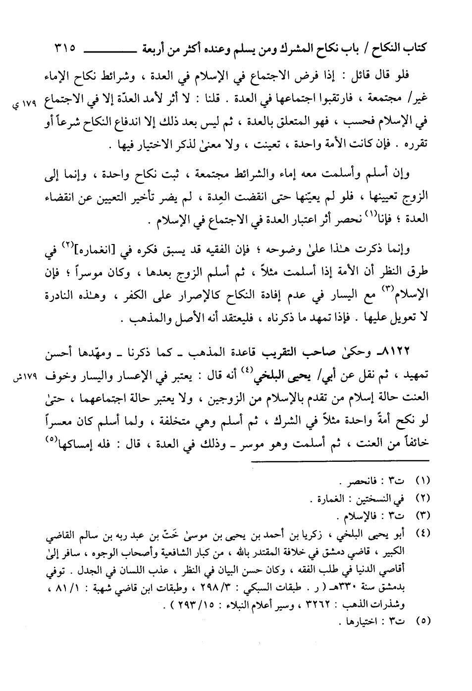 (4) أبو يحيى البلخي، زكريا بن أحمد بن يحيى بن موسى خَتّ بن عبد ربه بن سالم القاضي الكبير، قاضي دمشق في خلافة المقتدر بالله، من كبار الشافعية وأصحاب الوجوه، سافر إلى أقاصي الدنيا في طلب الفقه، وكان حسن البيان في النظر، عذب اللسان في الجدل. توفي بدمشق سنة 330 هـ (ر. طبقات السبكي: 3/ 298، وطبفات ابن قاضي شهبة: 1/ 81، وشذرات الذهب: 3262، وسير أعلام النبلاء: 15/ 293).