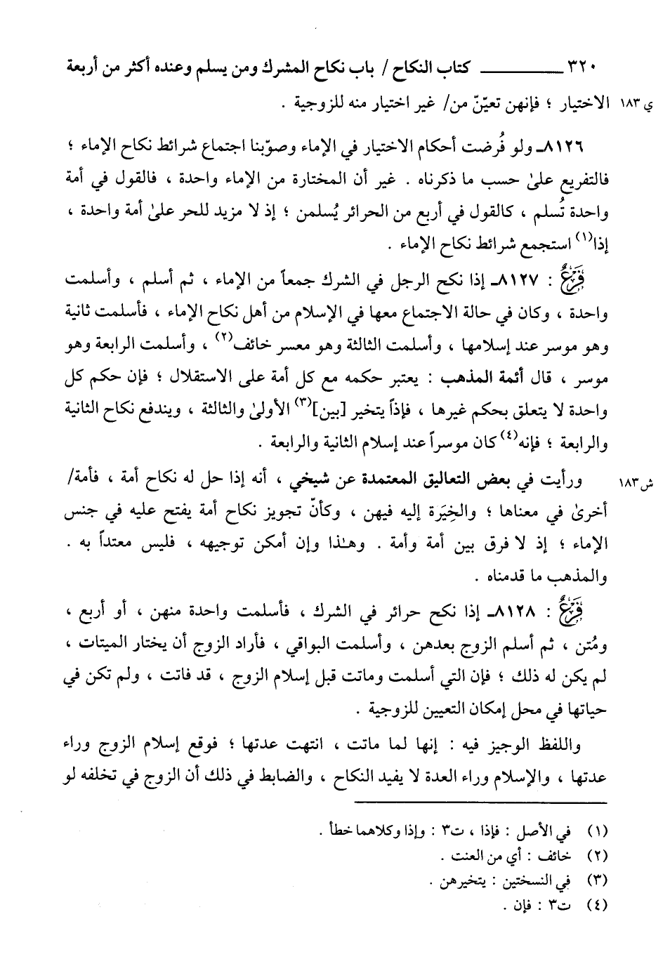 8126 - ولو فُرضت أحكام الاختيار في الإماء وصوّبنا اجتماع شرائط نكاح الإماء؛ فالتفريع على حسب ما ذكرناه. غير أن المختارة من الإماء واحدة، فالقول في أمة واحدة تُسلم، كالقول في أربع من الحرائر يُسلمن؛ إذ لا مزيد للحر على أمة واحدة، إذا (1) استجمع شرائط نكاح الإماء.