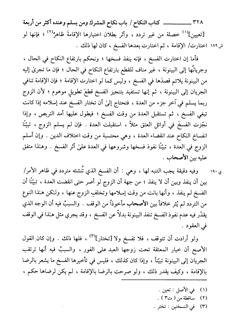 وفيه دقيقة يجب التنبه لها، وهي: أن الفسخ الذي تُنشئه متردد في ظاهر الأمر بين أن ينفذ وبين أن لا ينفذ؛ من جهة أن الزوج لو أصر حتى انقضت العدة، تبيّنّا أن الفسخ لم ينفذ، وأنها بانت من وقت إسلامها وتخلفِ الزوج عنها، ولكن هذا النوع من التردد لم يُثر خلافاً بين الأصحاب مأخوذاً من الوقف. والسببُ فيه أن الوجه الذي يقدّر فيه عدم نفوذ الفسخ تنفذ البينونة بدلاً عن الفسخ، وقد يجري مثل هذا في الوقف في العقود.