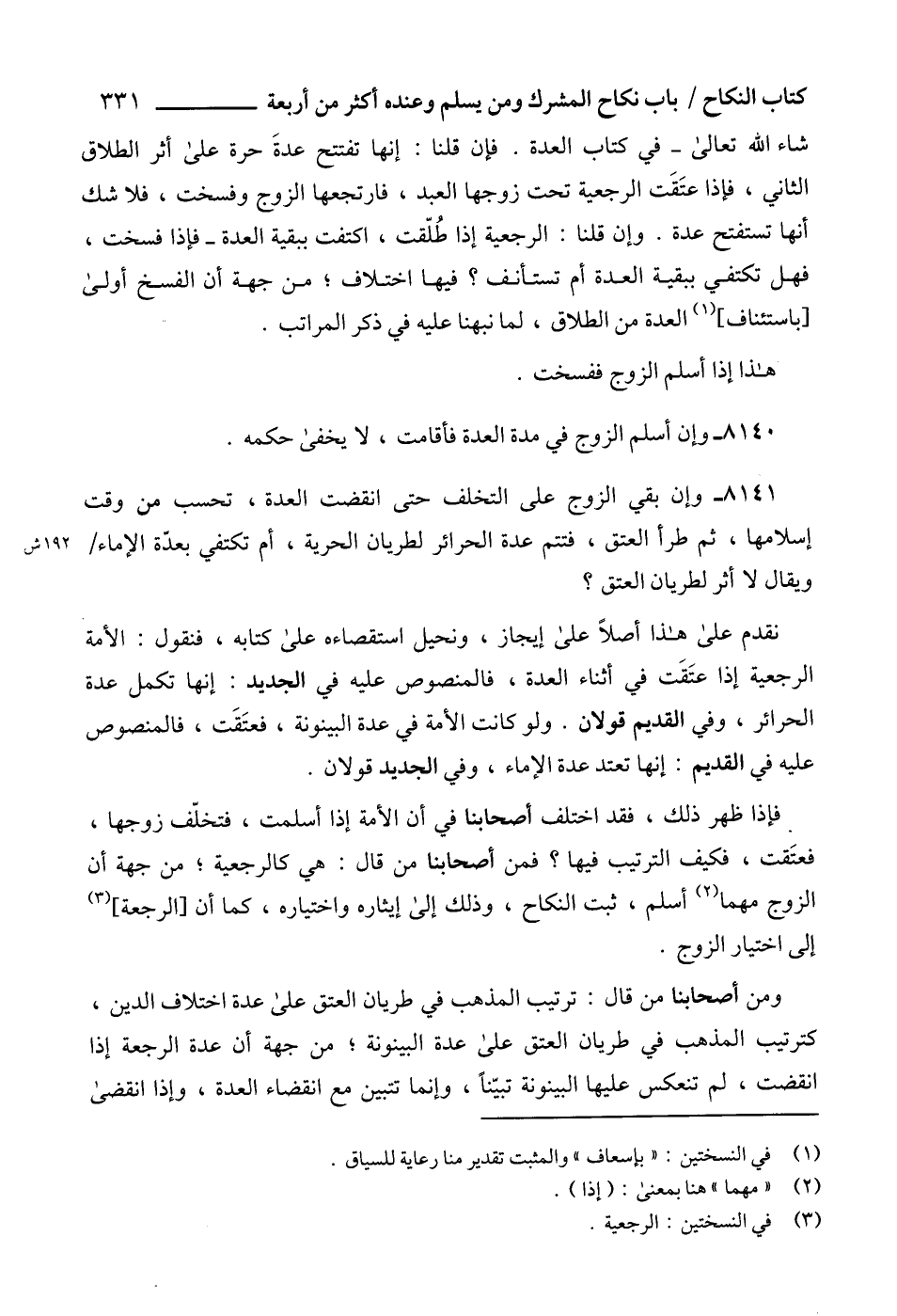8141 - وإن بقي الزوج على التخلف حتى انقضت العدة، تحسب من وقت إسلامها، ثم طرأ العتق، فتتم عدة الحرائر لطريان الحرية، أم تكتفي بعدّة الإماء ويقال لا أثر لطريان العتق؟
