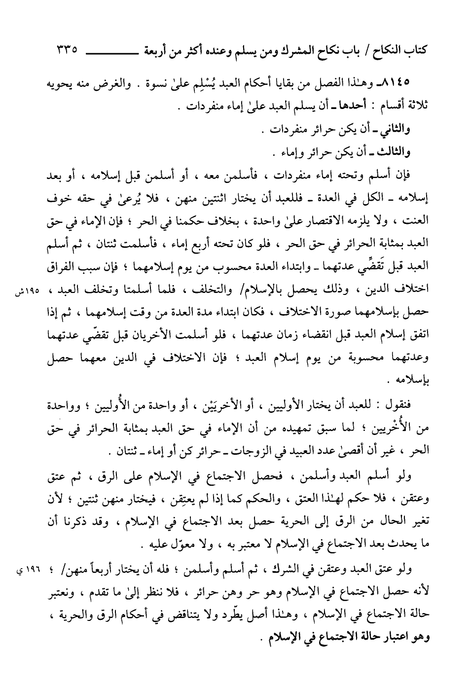 8145 - وهذا الفصل من بقايا أحكام العبد يُسْلِم على نسوة. والغرض منه يحويه ثلاثة أقسام: أحدها - أن يسلم العبد على إماء منفردات.