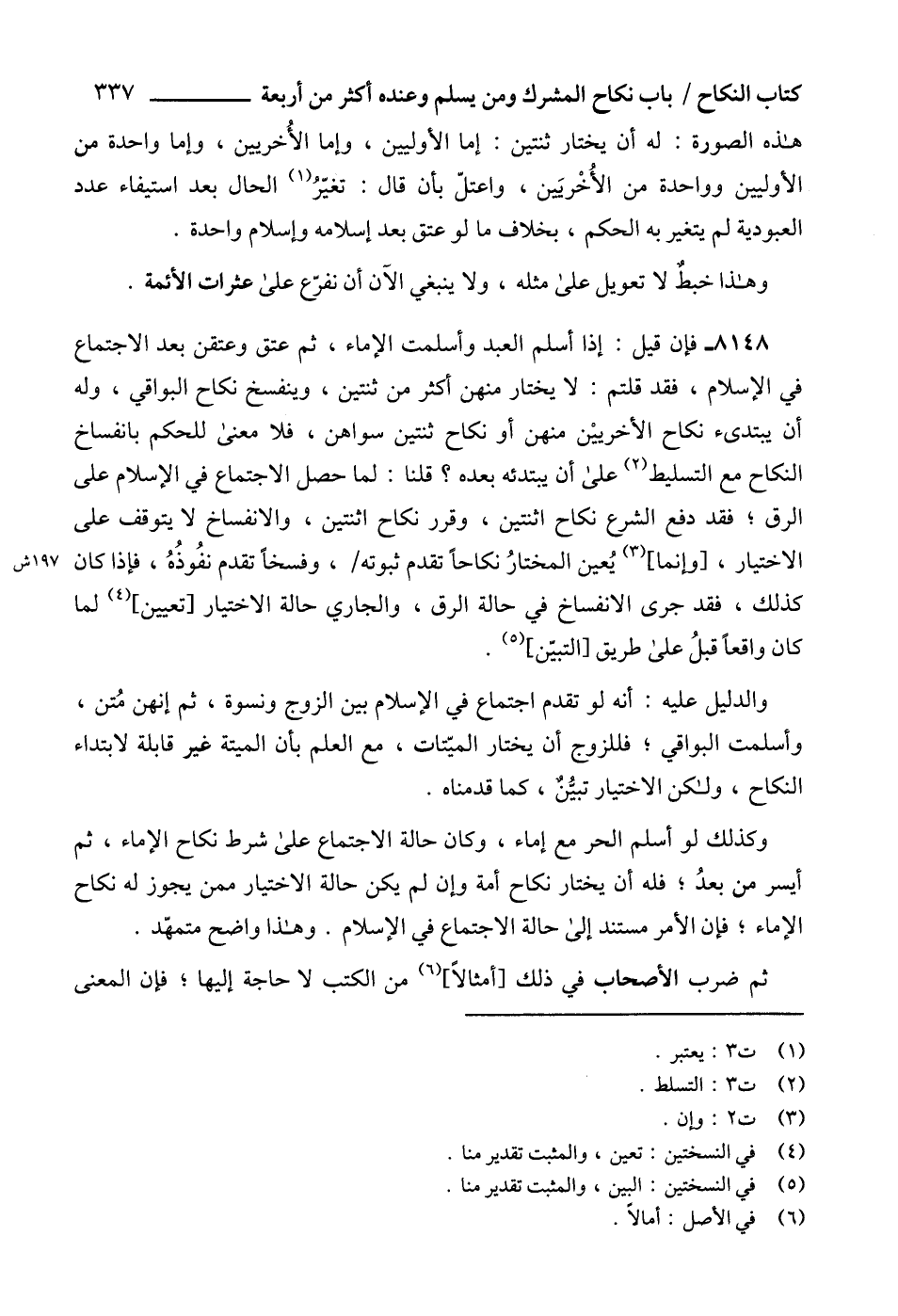 8148 - فإن قيل: إذا أسلم العبد وأسلمت الإماء، ثم عتق وعتقن بعد الاجتماع في الإسلام، فقد قلتم: لا يختار منهن أكثر من ثنتين، وينفسخ نكاح البواقي، وله أن يبتدىء نكاح الأخرييْن منهن أو نكاح ثنتين سواهن، فلا معنى للحكم بانفساخ النكاح مع التسليط (2) على أن يبتدئه بعده؟ قلنا: لما حصل الاجتماع في الإسلام على الرق؛ فقد دفع الشرع نكاح اثنتين، وقرر نكاح اثنتين، والانفساخ لا يتوقف على الاختيار، [وإنما] (3) يُعين المختارُ نكاحاً تقدم ثبوته، وفسخاً تقدم نفُوذُهُ، فإذا كان كذلك، فقد جرى الانفساخ في حالة الرق، والجاري حالة الاختيار [تعيين] (4) لما كان واقعاً قبلُ على طريق [التبيّن] (5).
