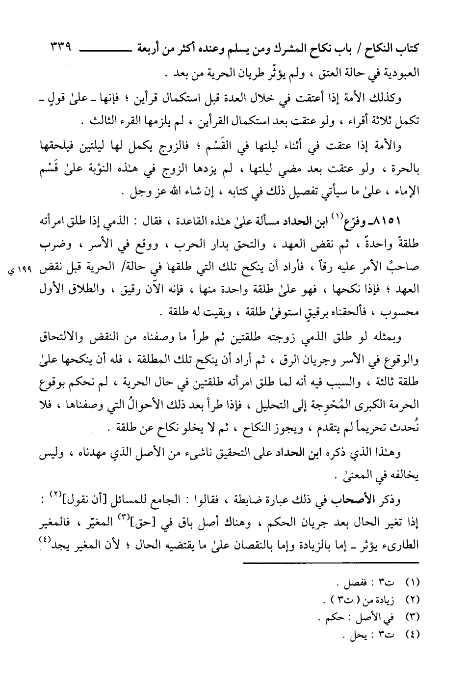8151 - وفرّع (1) ابن الحداد مسألة على هذه القاعدة، فقال: الذمي إذا طلق امرأته طلقةً واحدةً، ثم نقض العهد، والتحق بدار الحرب، ووقع في الأسر، وضرب صاحبُ الأمر عليه رقاً، فأراد أن ينكح تلك التي طلقها في حالة الحرية قبل نقض العهد؛ فإذا نكحها، فهو على طلقة واحدة منها، فإنه الآن رقيق، والطلاق الأول محسوب، فألحقناه برقيقٍ استوفى طلقة، وبقيت له طلقة.