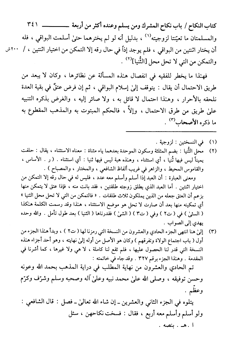 (3) إلى هنا انتهى الجزء الحادي والعشرون من النسخة التي رمزنا لها (ت 2)، وبدأ هذا الجزء من أول (باب اجتماع الولاة وتفرقهم) وكان هو الأصل من أوله إلى نهايته، وهو أحد أجزاء هذه النسخة التي قدر لنا الحصول عليها، فلم تقع لنا كاملة، لا هي ولا غيرها، كما أشرنا في المقدمة. وهذا الجزء برقم 327. وقد جاء في خاتمته: