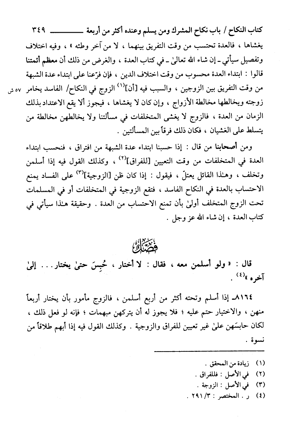 8164 - إذا أسلم وتحته أكثر من أربع أسلمن، فالزوج مأمور بأن يختار أربعاً منهن، والاختيار حتم عليه؛ فلا يجوز له أن يتركهن مبهمات؛ فإنه لو فعل ذلك، لكان حابسَهن على غير تعيين للفراق والزوجية. وكذلك القول فيه إذا أبهم طلاقاً من نسوة.