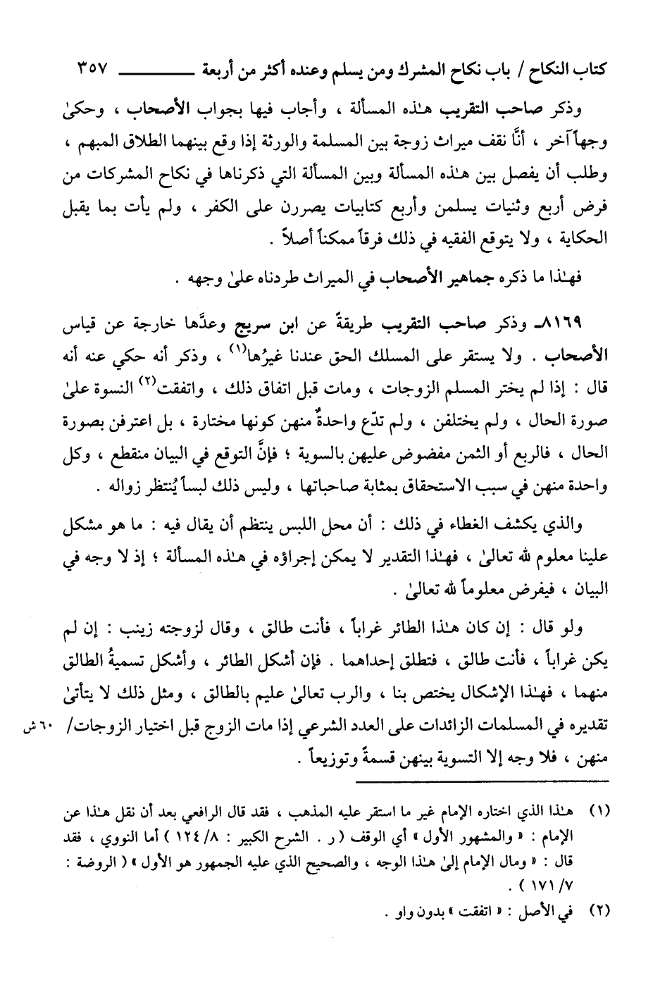 (1) هذا الذىِ اختاره الامام غير ما استقر عليه المذهب، فقد قال الرافعي بعد أن نقل هذا عن الإمام: "والمشهور الأول" أي الوقف (ر. الشرح الكبير: 8/ 124) أما النووي، فقد قال: "ومال الإمام إلى هذا الوجه، والصحيح الذي عليه الجمهور هو الأول" (الروضة: 7/ 171).