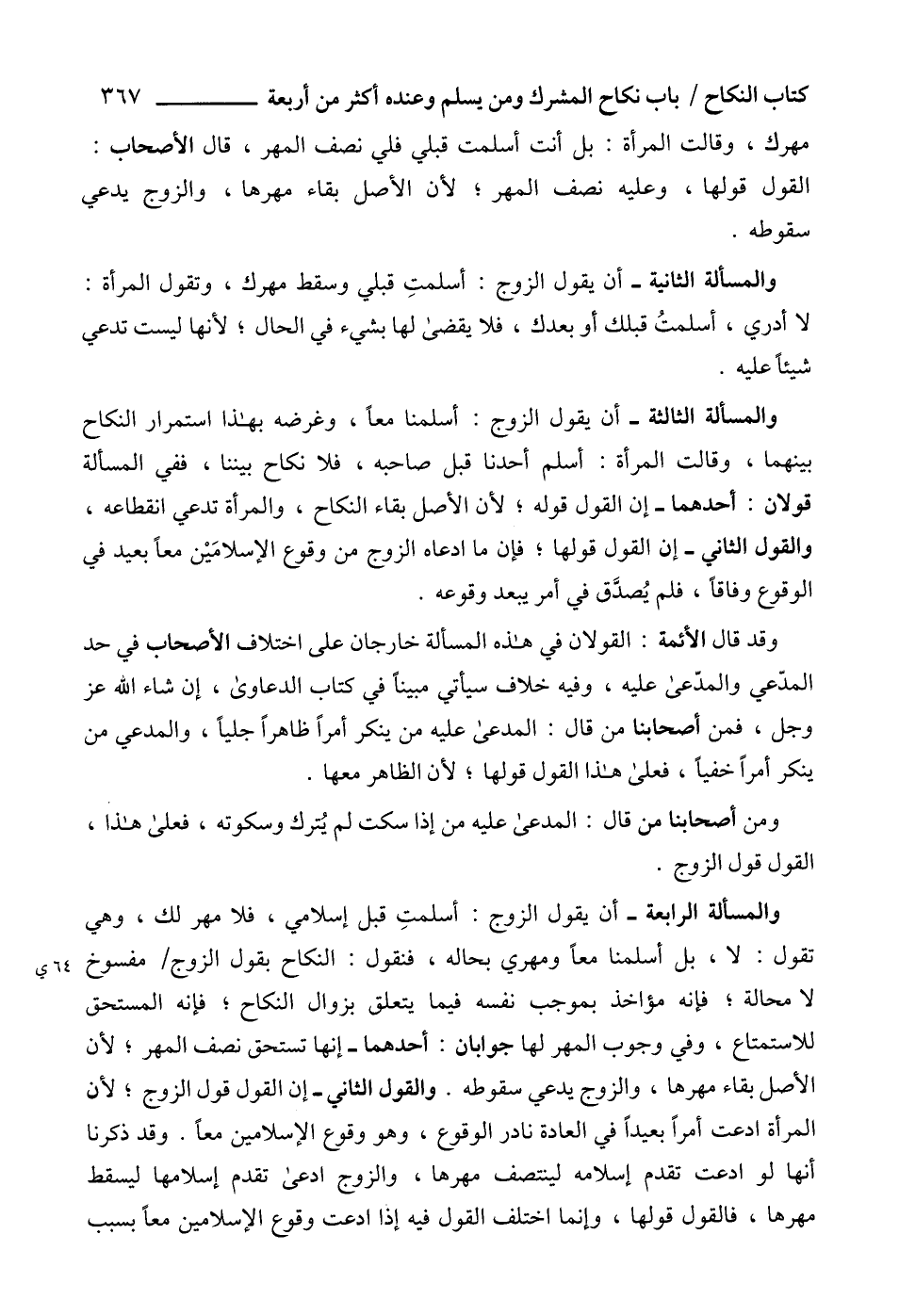 والمسألة الرابعة - أن يقول الزوج: أسلمتِ قبل إسلامي، فلا مهر لك، وهي تقول: لا، بل أسلمنا معاً ومهري بحاله، فنقول: النكاح بقول الزوج مفسوخ لا محالة؛ فانه مؤاخذ بموجب نفسه فيما يتعلق بزوال النكاح؛ فإنه المستحق للاستمتاع، وفي وجوب المهر لها جوابان: أحدهما - إنها تستحق نصف المهر؛ لأن الأصل بقاء مهرها، والزوج يدعي سقوطه. والقول الثاني - إن القول قول الزوج؛ لأن المرأة ادعت أمراً بعيداً في العادة نادر الوقوع، وهو وقوع الإسلامين معاً. وقد ذكرنا أنها لو ادعت تقدم إسلامه لينتصف مهرها، والزوج ادعى تقدم إسلامها ليسقط مهرها، فالقول قولها، وإنما اختلف القول فيه إذا ادعت وقوع الإسلامين معاً بسبب