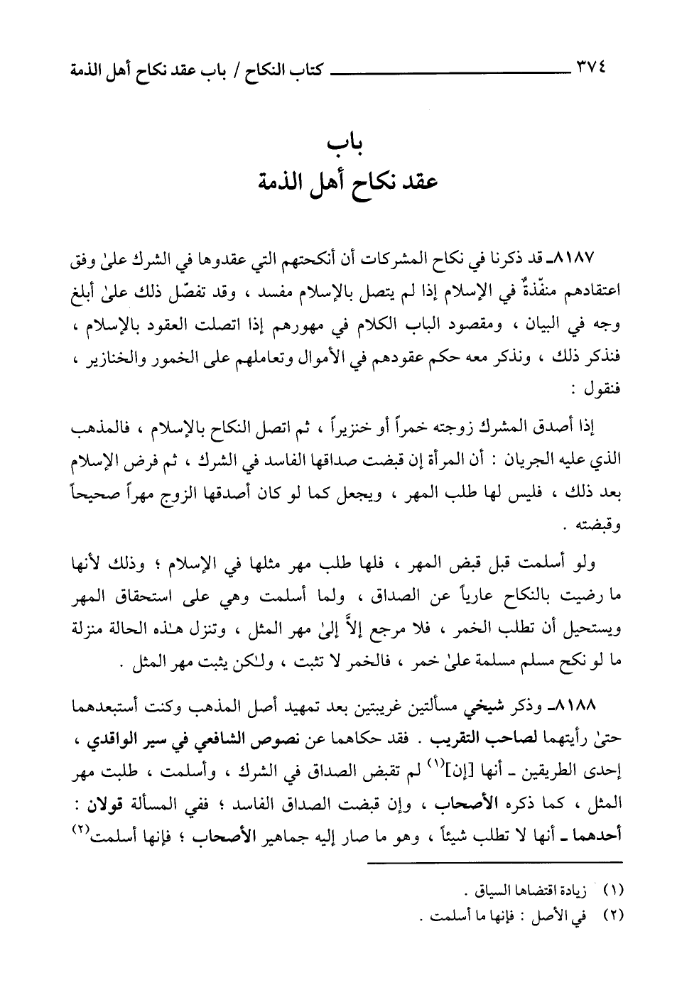 8187 - قد ذكرنا في نكاح المشركات أن أنكحتهم التي عقدوها في الشرك على وفق اعتقادهم منفّذةٌ في الإسلام إذا لم يتصل بالإسلام مفسد، وقد تفصّل ذلك على أبلغ وجه في البيان، ومقصود الباب الكلام في مهورهم إذا اتصلت العقود بالإسلام، فنذكر ذلك، ونذكر معه حكم عقودهم في الأموال وتعاملهم على الخمور والخنازير، فنقول: