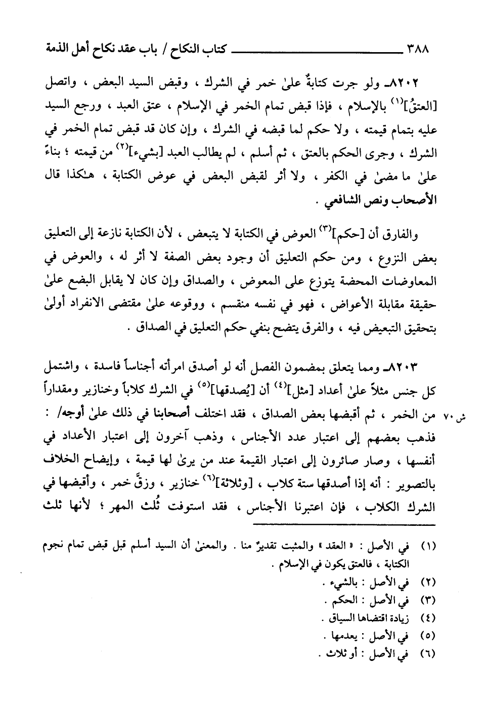 8202 - ولو جرت كتابةٌ على خمر في الشرك، وقبض السيد البعض، واتصل [العتقُ] (1) بالإسلام، فإذا قبض تمام الخمر في الإسلام، عتق العبد، ورجع السيد عليه بتمام قيمته، ولا حكم لما قبضه في الشرك، وإن كان قد قبض تمام الخمر في الشرك، وجرى الحكم بالعتق، ثم أسلم، لم يطالب العبد [بشيء] (2) من قيمته؛ بناءً على ما مضى في الكفر، ولا أثر لقبض البعض في عوض الكتابة، هكذا قال الأصحاب ونص الشافعي.