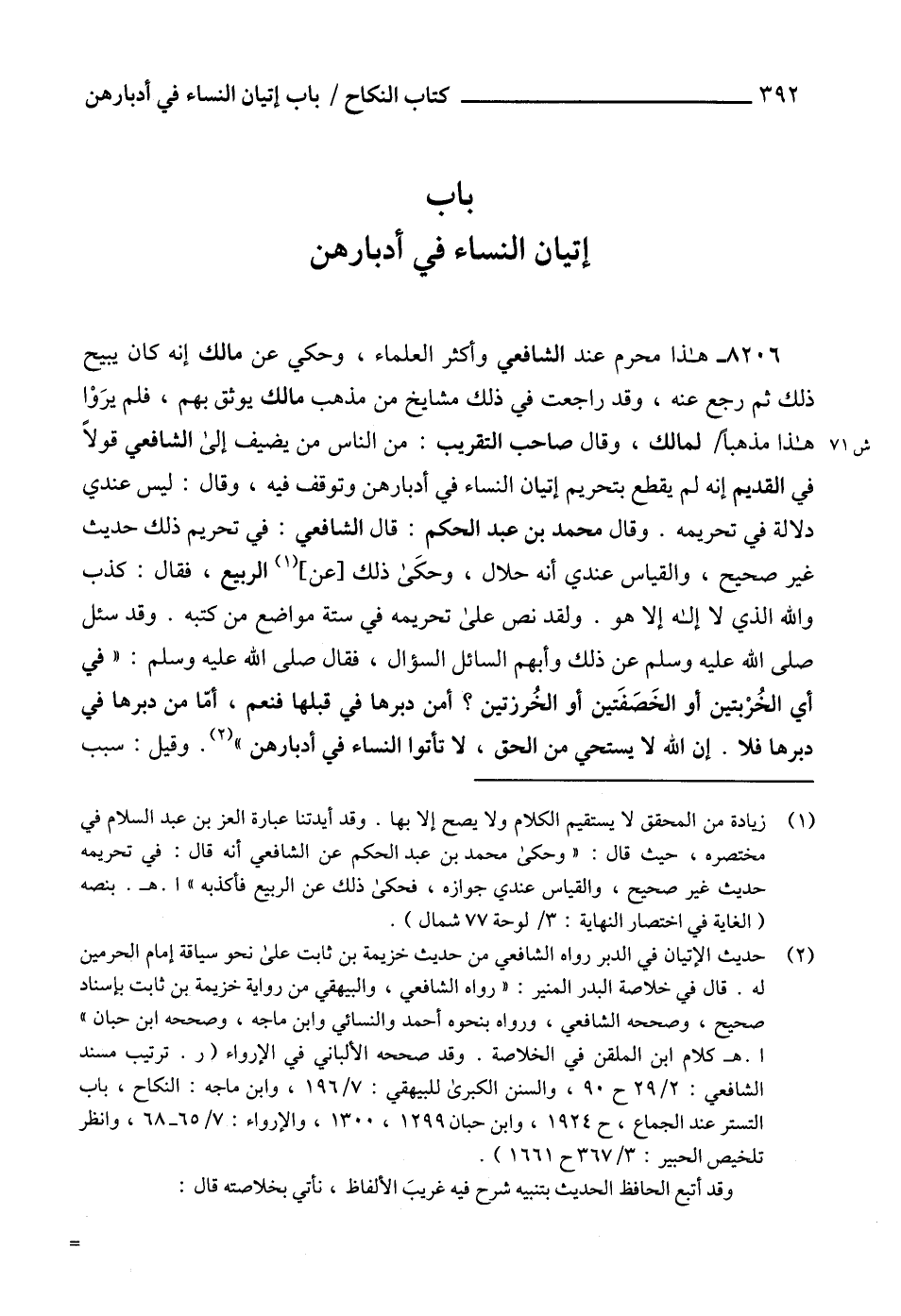 8206 - هذا محرم عند الشافعي وأكثر العلماء، وحكي عن مالك إنه كان يبيح ذلك ثم رجع عنه، وقد راجعت في ذلك مشايخ من مذهب مالك يوثق بهم، فلم يرَوْا هذا مذهباً لمالك، وقال صاحب التقريب: من الناس من يضيف إلى الشافعي قولاً في القديم إنه لم يقطع بتحريم إتيان النساء في أدبارهن وتوقف فيه، وقال: ليس عندي دلالة في تحريمه. وقال محمد بن عبد الحكم: قال الشافعي: في تحريم ذلك حديث غير صحيح، والقياس عندي أنه حلال، وحكَى ذلك [عن] (1) الربيع، فقال: كذب والله الذي لا إله إلا هو. ولقد نص على تحريمه في ستة مواضع من كتبه. وقد سئل صلى الله عليه وسلم عن ذلك وأبهم السائل السؤال، فقال صلى الله عليه وسلم: "في أي الخُرْبتين أو الخَصَفَتين أو الخُرزتين؟ أمن دبرها في قبلها فنعم، أمّا من دبرها في دبرها فلا. إن الله لا يستحي من الحق، لا تأتوا النساء في أدبارهن" (2). وقيل: سبب
