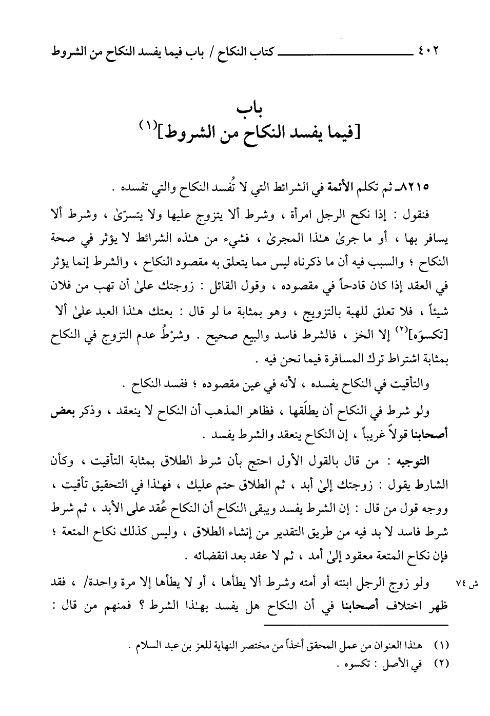 8215 - ثم تكلم الأئمة في الشرائط التي لا تُفسد النكاح والتي تفسده.