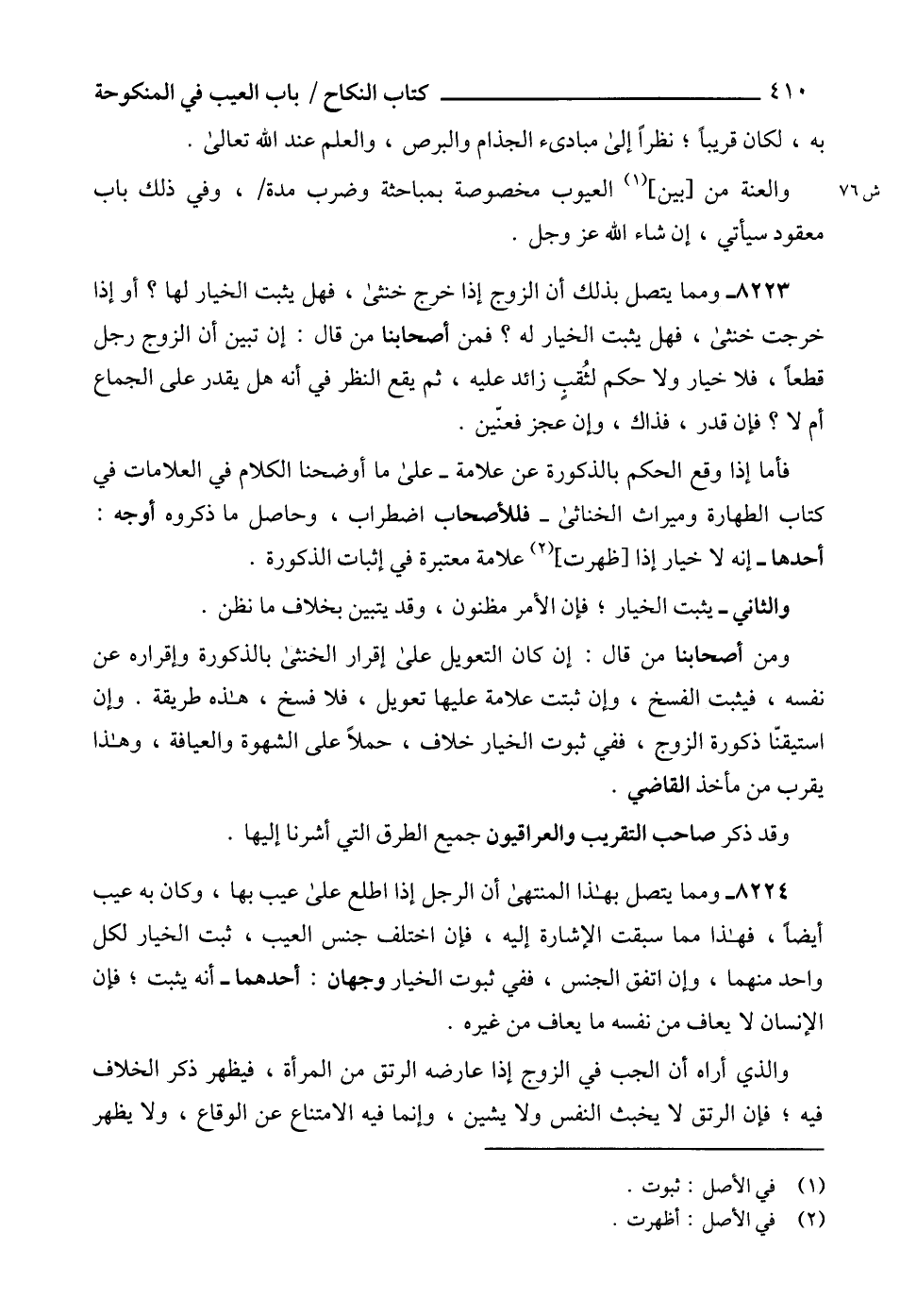 8223 - ومما يتصل بذلك أن الزوج إذا خرج خنثى، فهل يثبت الخيار لها؟ أو إذا خرجت خنثى، فهل يثبت الخيار له؟ فمن أصحابنا من قال: إن تبين أن الزوج رجل قطعاً، فلا خيار ولا حكم لثُقبٍ زائد عليه، ثم يقع النظر في أنه هل يقدر على الجماع أم لا؟ فإن قدر، فذاك، وإن عجز فعنّين.