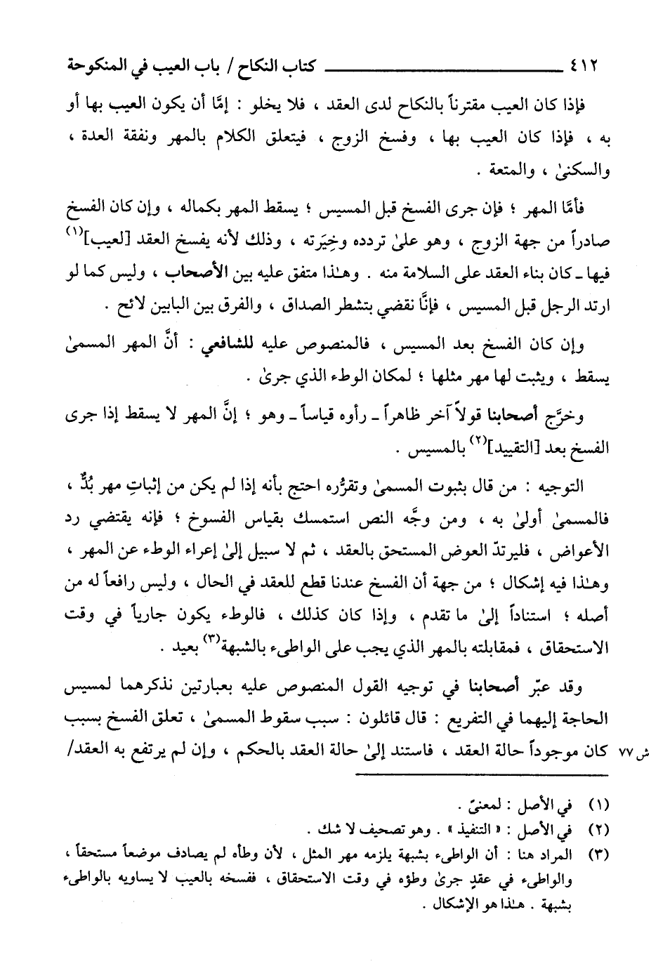 (3) المراد هنا: أن الواطىء بشبهة يلزمه مهر المثل، لأن وطأه لم يصادف موضعاً مستحقاً، والواطىء في عقدٍ جرى وطؤه في وقت الاستحقاق، ففسخه بالعيب لا يساويه بالواطىء بشبهة. هذا هو الإشكال.