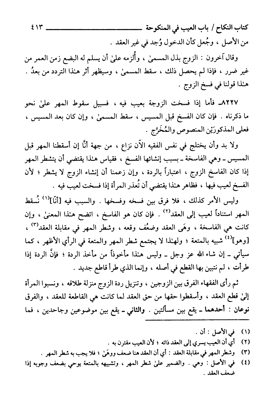 8227 - فأما إذا فسخت الزوجة بعيب فيه، فسبيل سقوط المهر على نحو ما ذكرناه. فإن كان الفسخ قبل المسيس، سقط المسمى، وإن كان بعد المسيس، فعلى المذكورَيْن المنصوص والمُخَرَّج.