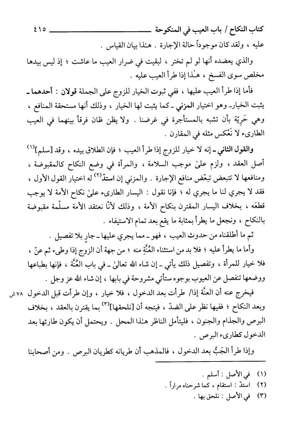 فيخرج عنه أن العنَّة إذا طرأت بعد الدخول، فلا خيار، وإن طرأت قبل الدخول وبعد النكاح؛ ففيها نظر على الضدّ، فيتجه أن [نلحقها] (3) بما يقترن بالعقد، بخلاف البرص والجذام والجنون، فليتأمل الناظر هذا المحل. ويحتمل أن يكون طارئها بعد الدخول كطارىء البرص.