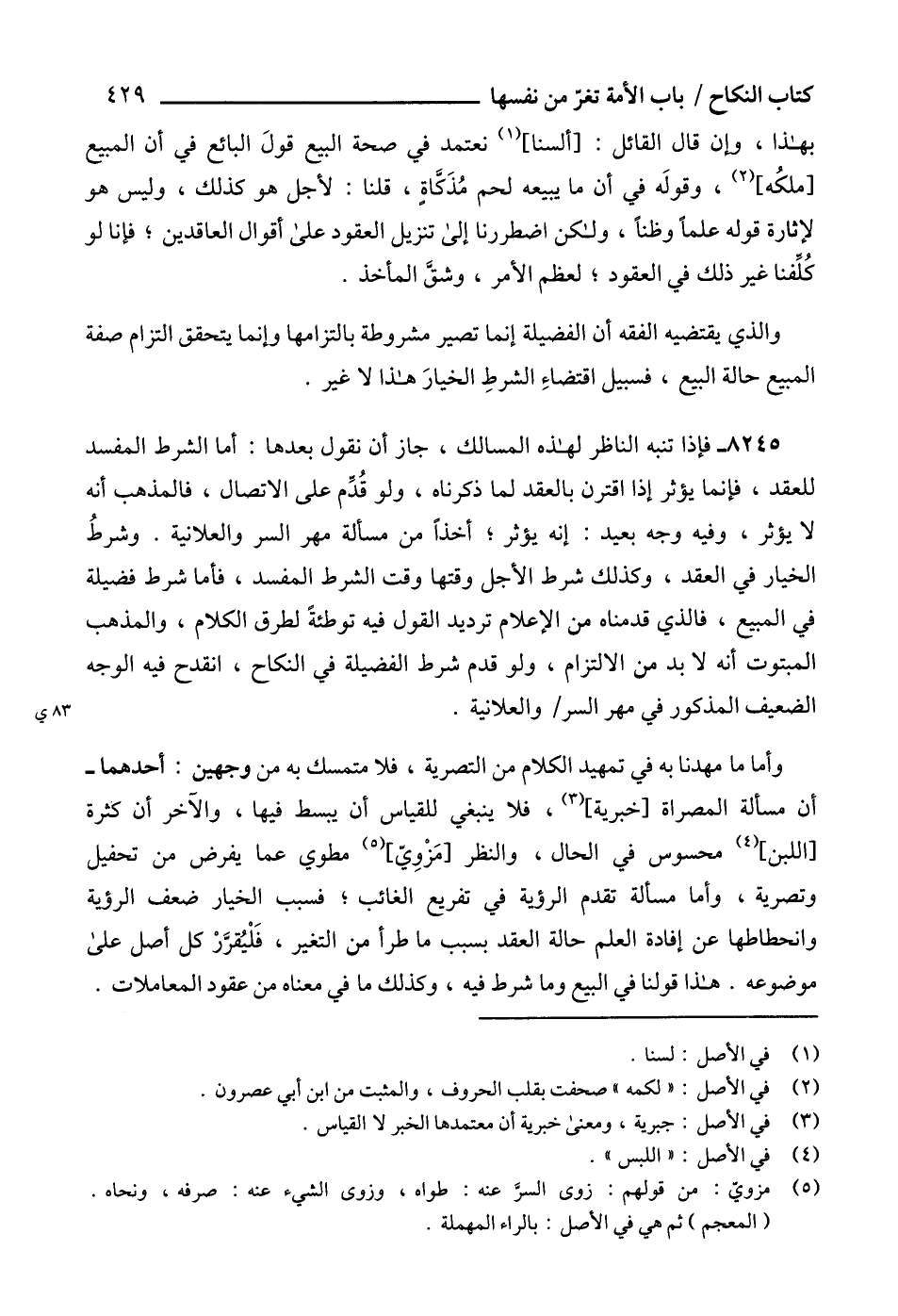 وأما ما مهدنا به في تمهيد الكلام من التصرية، فلا متمسك به من وجهين: أحدهما - أن مسألة المصراة [خبرية] (3)، فلا ينبغي للقياس أن يبسط فيها، والآخر أن كثرة [اللبن] (4) محسوس في الحال، والنظر [مَزْوِيّ] (5) مطوي عما يفرض من تحفيل وتصرية، وأما مسألة تقدم الرؤية في تفريع الغائب؛ فسبب الخيار ضعف الرؤية وانحطاطها عن إفادة العلم حالة العقد بسبب ما طرأ من التغير، فَلْيُقرَّرْ كل أصل على موضوعه. هذا قولنا في البيع وما شرط فيه، وكذلك ما في معناه من عقود المعاملات.