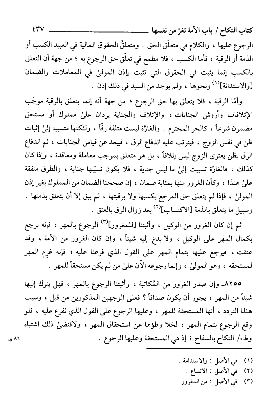وأمّا الرقبة، فلا يتعلق بها حق الرجوع؛ من جهة أنه إنما يتعلق بالرقبة موجَب الإتلافات وأروش الجنايات، والإتلاف والجناية يردان على مملوك أو مستحق مضمون شرعاً، كالحر المحترم. والغارَّة ليست متلفة رقّاً، ولكنها متسببه إلى إثبات ظن في نفس الزوج، فيترتب عليه اندفاع الرق، فيبعد عن قياس الجنايات، ثم اندفاع الرق بظن يعتري الزوج ليس إتلافاً، بل هو متعلق بموجب معاملة ومعاقدة، وإذا كان كذلك، فالغارّة تسببت إلى ما ليس جناية، فلا يكون تسبّبها جناية، والطرق متفقة على هذا، وكأن الغرور منها بمثابة ضمان، إن صححنا الضمان من المملوك بغير إذن المولى، فإذا لم يتعلق حق المرجع بكسبها ولا برقبتها، لم يبق إلا أن يتعلق بذمتها. وسبيل ما يتعلق بالذمة [الاكتساب] (2) بعد زوال الرق بالعتق.
