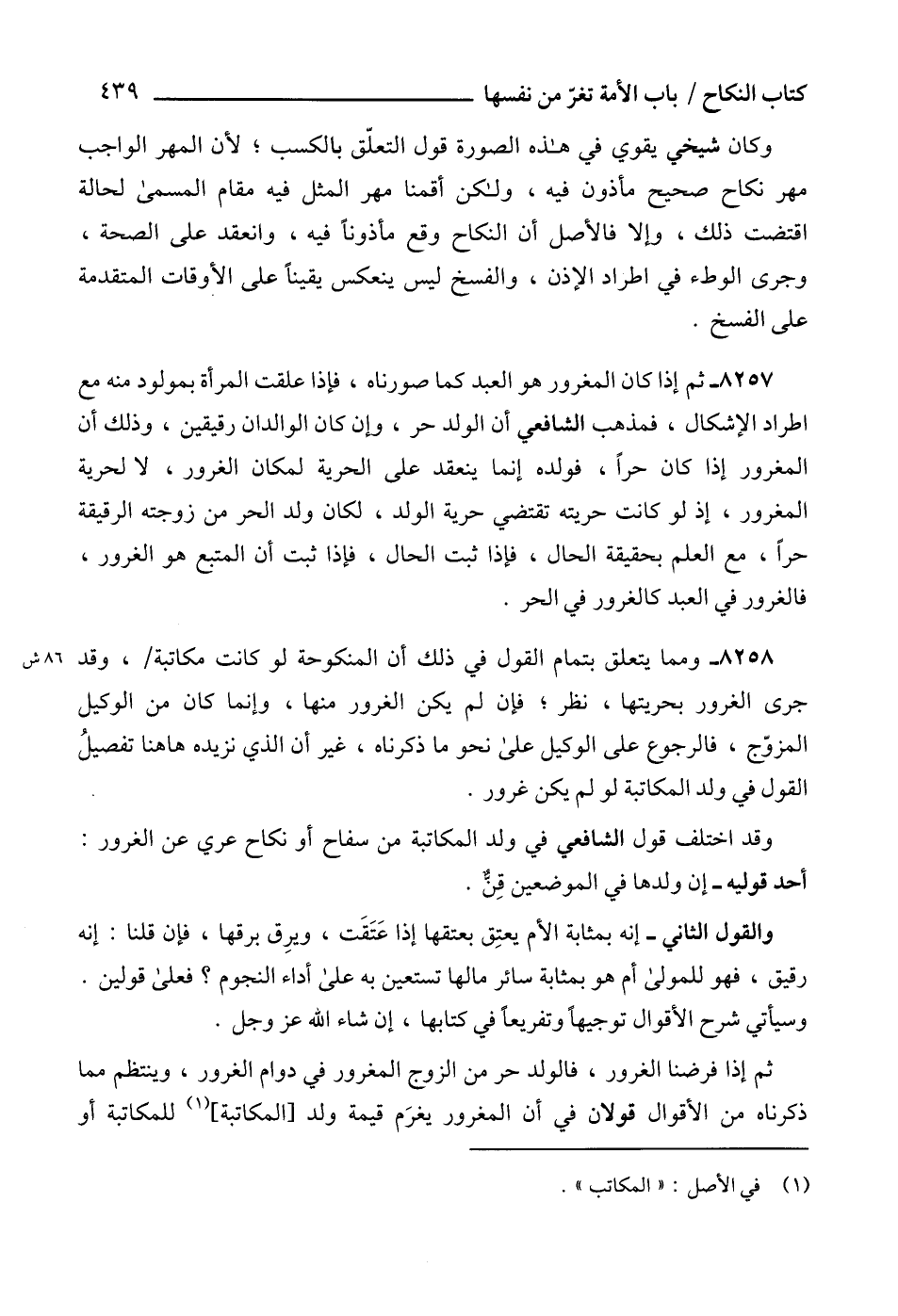8258 - ومما يتعلق بتمام القول في ذلك أن المنكوحة لو كانت مكاتبة، وقد جرى الغرور بحريتها، نظر؛ فإن لم يكن الغرور منها، وإنما كان من الوكيل المزوّج، فالرجوع على الوكيل على نحو ما ذكرناه، غير أن الذي نزيده هاهنا تفصيلُ القول في ولد المكاتبة لو لم يكن غرور.