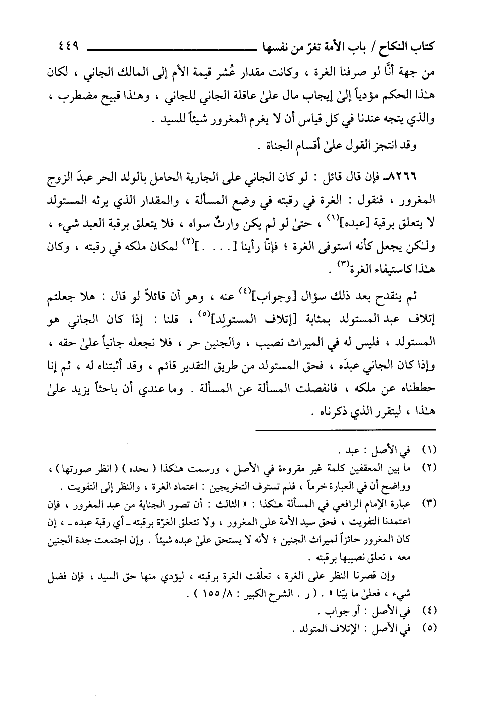 (3) عبارة الإمام الرافعي في المسألة هكذا: "الثالث: أن تصور الجناية من عبد المغرور، فإن اعتمدنا التفويت، فحق سيد الأمة على المغرور، ولا تتعلق الغرة برقبته -أي رقبة عبده-، إن كان المغرور حائزاً لميراث الجنين؛ لأنه لا يستحق على عبده شيئاًَ. وإن اجتمعت جدة الجنين معه، تعلق نصيبها برقبته.