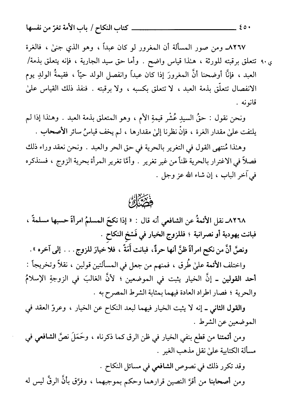 ونصَّ أنَّ من نكح امرأةً ظنَّ أنها حرةٌ، فبانت أَمَةً، فلا خيارَ للزوج ... إلى آخره".