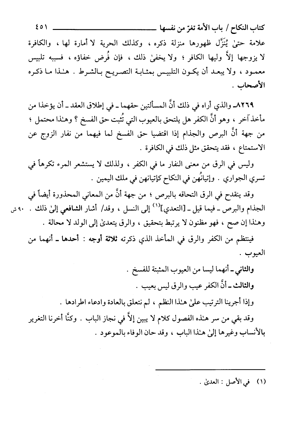 8269 - والذي أراه في ذلك أنَّ المسألتين حقهما -في إطلاق العقد- أن يؤخذا من مأخذ آخر، وهو أنَّ الكفر هل يلتحق بالعيوب التي تُثبت حق الفسخ؟ وهذا محتمل؛ من جهة أنَّ البرص والجذام إذا اقتضيا حق الفسخ لما فيهما من نفار الزوج عن الاستمتاع، فقد يتحقق مثل ذلك في الكافرة.
