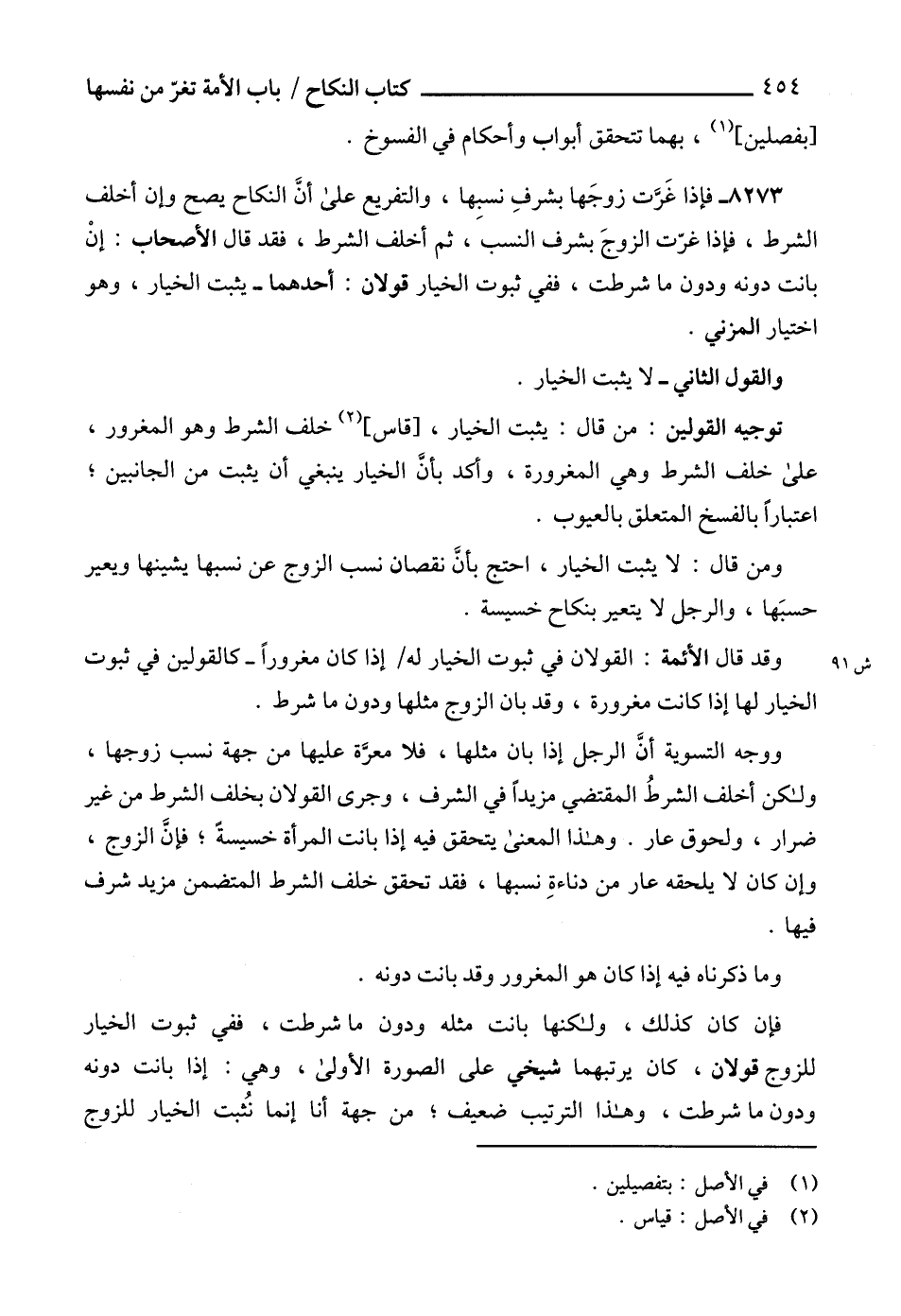8273 - فإذا غَرَّت زوجَها بشرفِ نسبها، والتفريع على أنَّ النكاح يصح وإن أخلف الشرط، فإذا غرّت الزوجَ بشرف النسبَ، ثم أخلف الشرط، فقد قال الأصحاب: إنْ بانت دونه ودون ما شرطت، ففي ثبوت الخيار قولان: أحدهما - يثبت الخيار، وهو اختيار المزني.