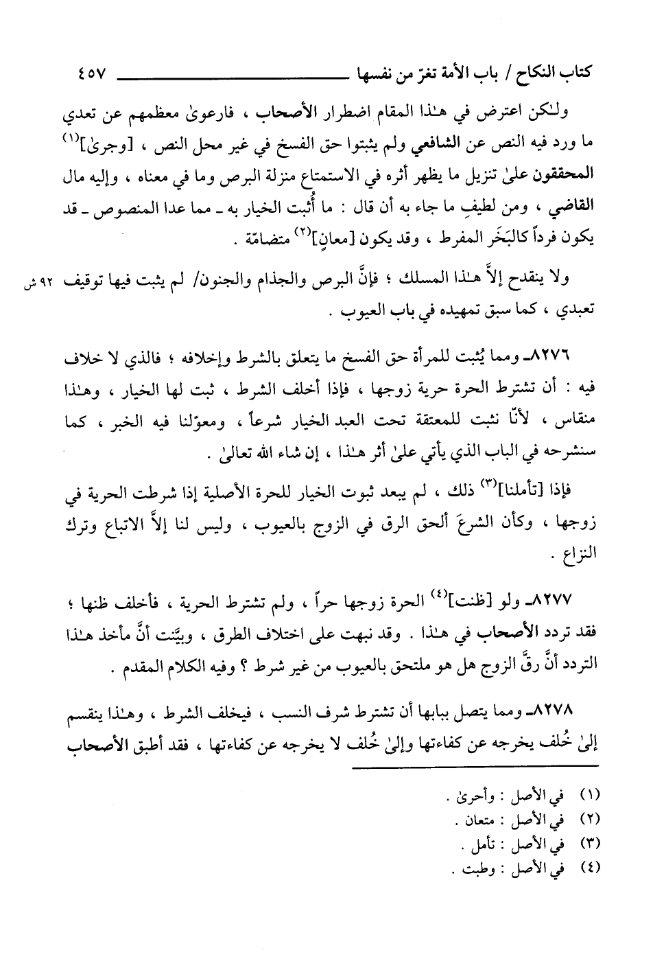 فإذا [تأملنا] (3) ذلك، لم يبعد ثبوت الخيار للحرة الأصلية إذا شرطت الحرية في زوجها، وكأن الشرعَ ألحق الرق في الزوج بالعيوب، وليس لنا إلاَّ الاتباع وترك النزاع.