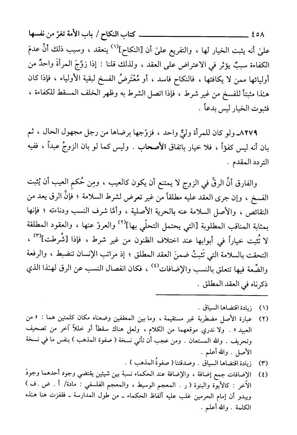 (2) عبارة الأصل مضطربة غير مستقيمة، وما بين المعقفين وضعناه مكان كلمتين هما: "من العبيد". ولا ندري موقعهما من الكلام، ولعل هناك سقطاً أو خللاً آخر من تصحيف وتحريف. والله المستعان. ومن عجب أن تأتي نسخة (صفوة المذهب) بنفس ما في نسخة الأصل. والله أعلم.