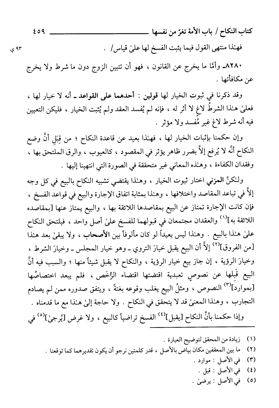 ولكنَّ المزني اختار ثبوت الخيار، وهذا يقتضي تشبيه النكاح بالبيع في كل وجه إلاَّ في تباعد المقاصد واختلافها، وهذا بمثابة اتفاق الإجارة والبيع في قواعد الفسخ، فإن كانت الإجارة تمتاز عن البيع بمقاصدها اللائقة بها، والبيع يمتاز عنها [بمقاصده اللائقة به] (1) والعقدان مجتمعان في قبولهما للفسخ على أصل واحد، فيلتحق النكاح على هذا بالبيع. وهذا ليس بعيداً لو كان مألوفاً بين الأصحاب، ولا يبقى بعد هذا [من الفروق] (2) إلاَّ أن البيع يقبل خيارَ التروي -وهو خيار المجلس- وخيارَ الشرط، وخيارَ الرؤية، إن جاز بيع خيار الرؤية، والنكاح لا يقبل شيئاًً منها؛ والسبب فيه أنَّ البيع قَبلها عن نصوصٍ تعبدية اقتضتها اقتضاء الرُّخَص، فلم يبعد اختصاصُها [بمواردَ] (3) النصوص، ومثلُ البيع يغلب وقوعه بغتةً، ويتفق صدوره ممن لم يصادم التجارب، وهذا المعنى قد لا يتحقق في النكاح. ولا حاجة إلى هذا مع ما قدمناه.