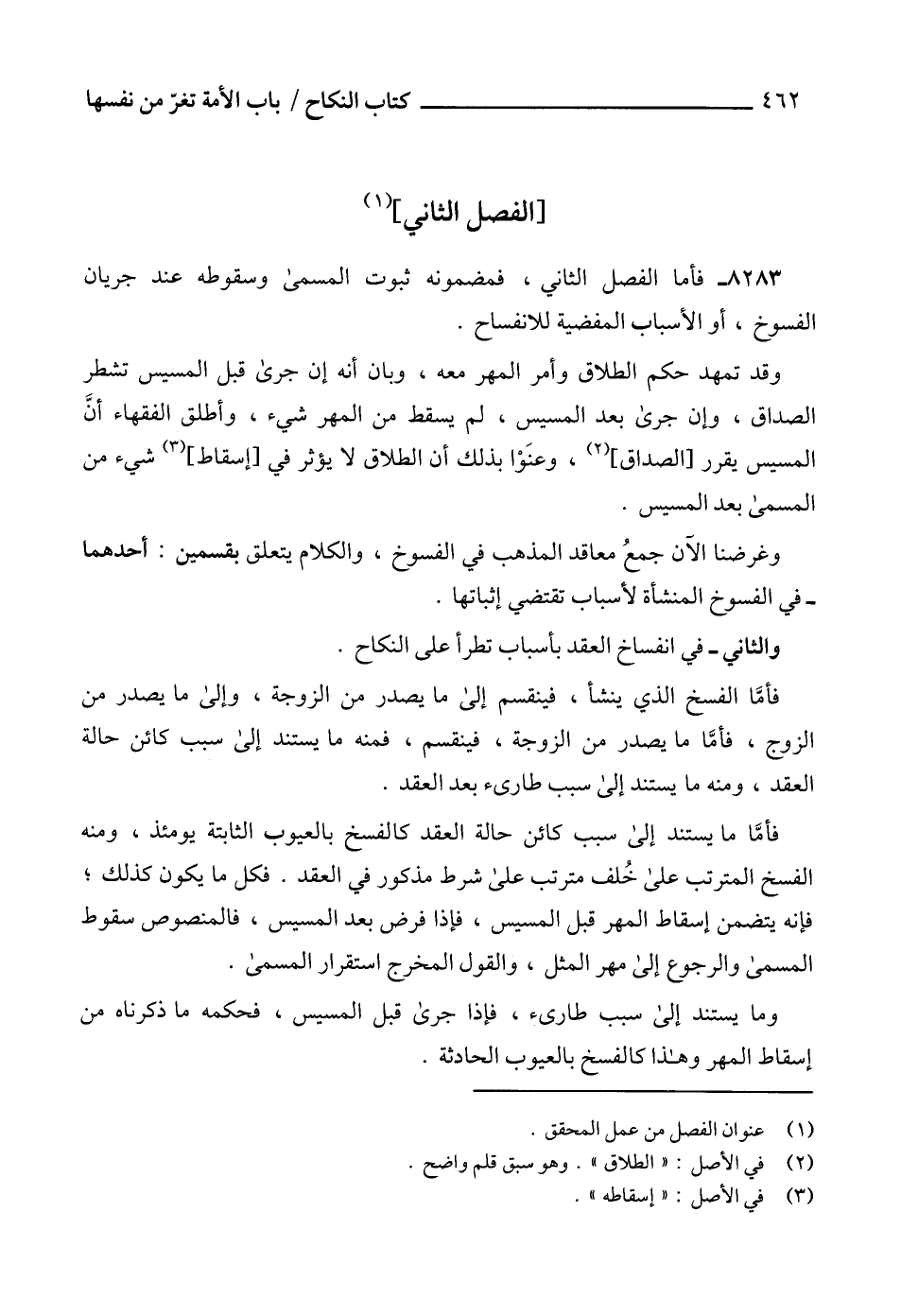 8283 - فأما الفصل الثاني، فمضمونه ثبوت المسمى وسقوطه عند جريان الفسوخ، أو الأسباب المفضية للانفساح.