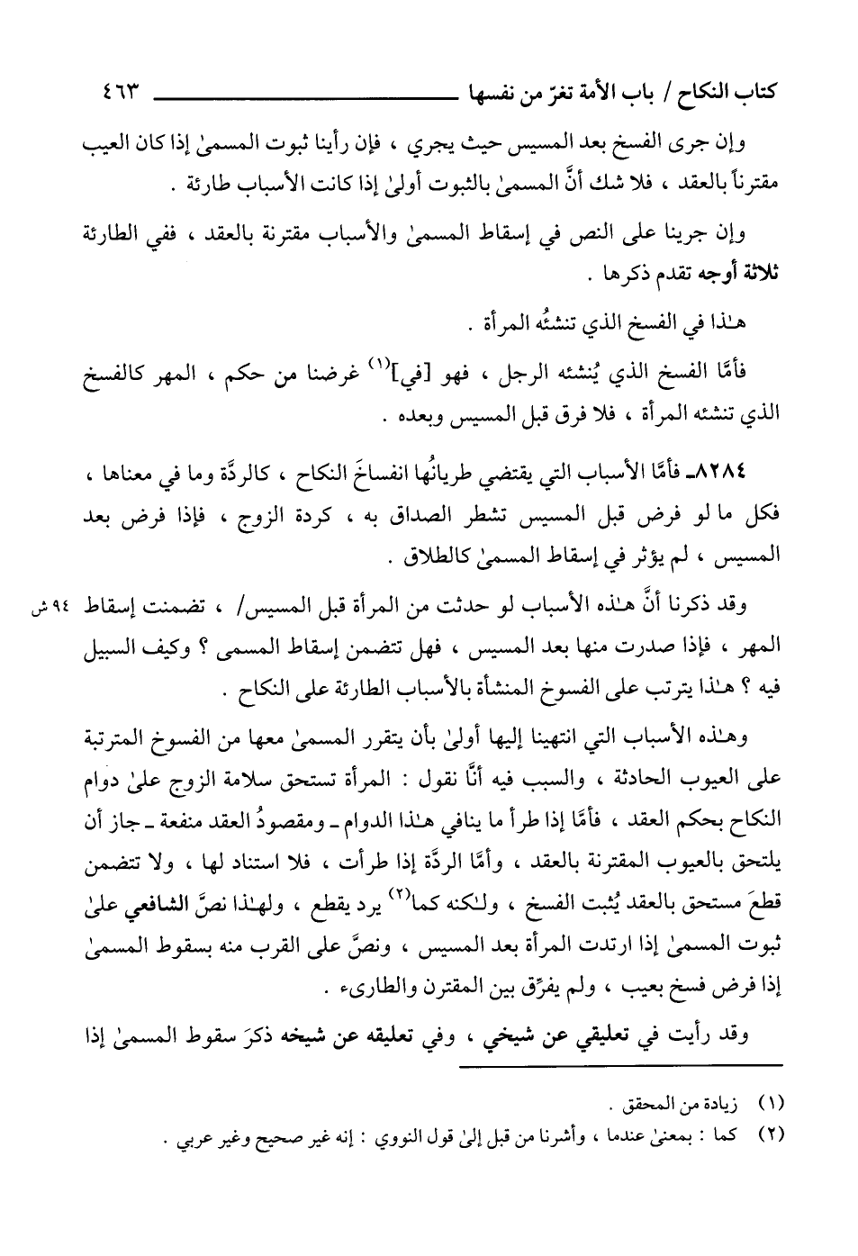 وقد ذكرنا أنَّ هذه الأسباب لو حدثت من المرأة قبل المسيس، تضمنت إسقاط المهر، فإذا صدرت منها بعد المسيس، فهل تتضمن إسقاط المسمى؟ وكيف السبيل فيه؟ هذا يترتب على الفسوخ المنشأة بالأسباب الطارئة على النكاح.