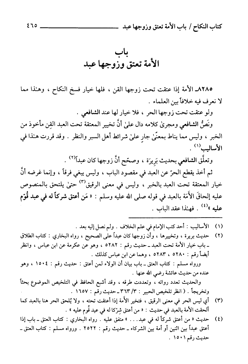 8285 - الأمة إذا عتقت تحت زوجها القن، فلها خيار فسخ النكاح، وهذا مما لا نعرف فيه خلافاً بين العلماء.